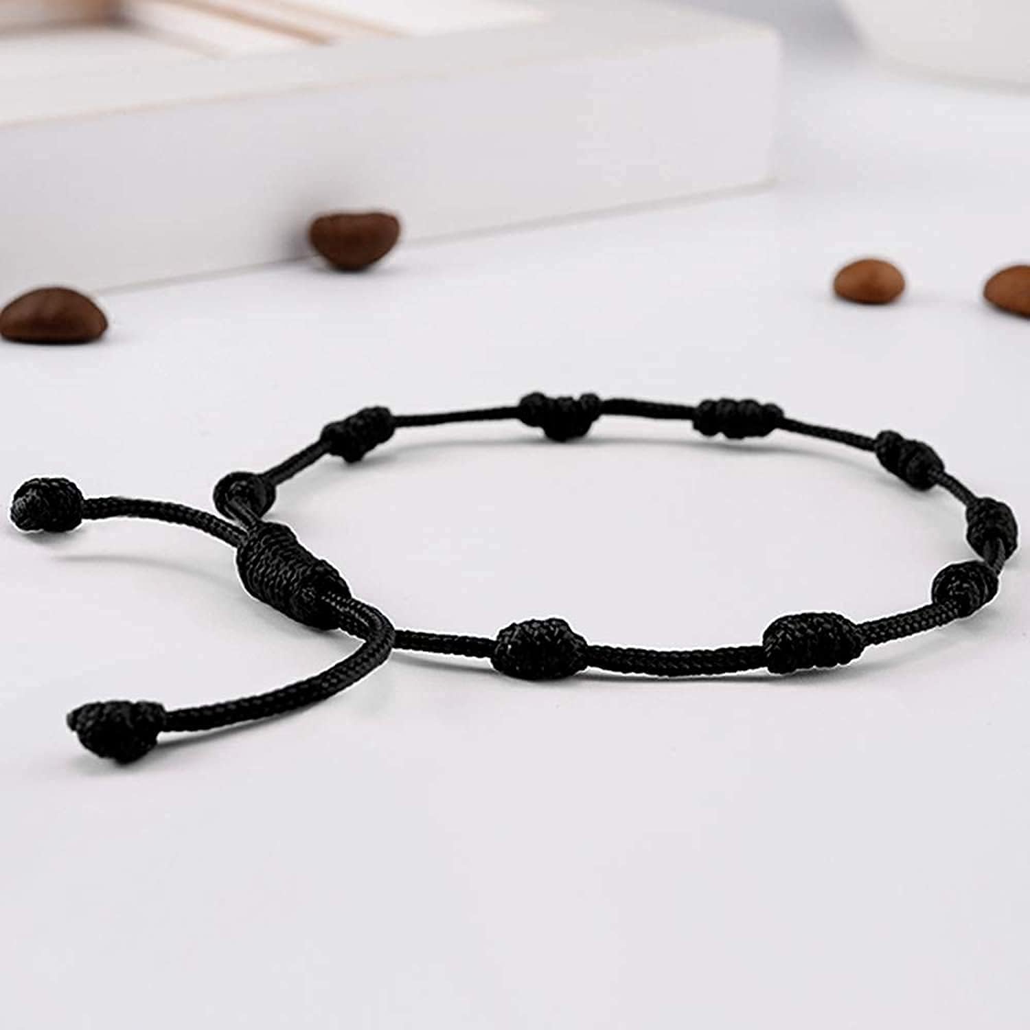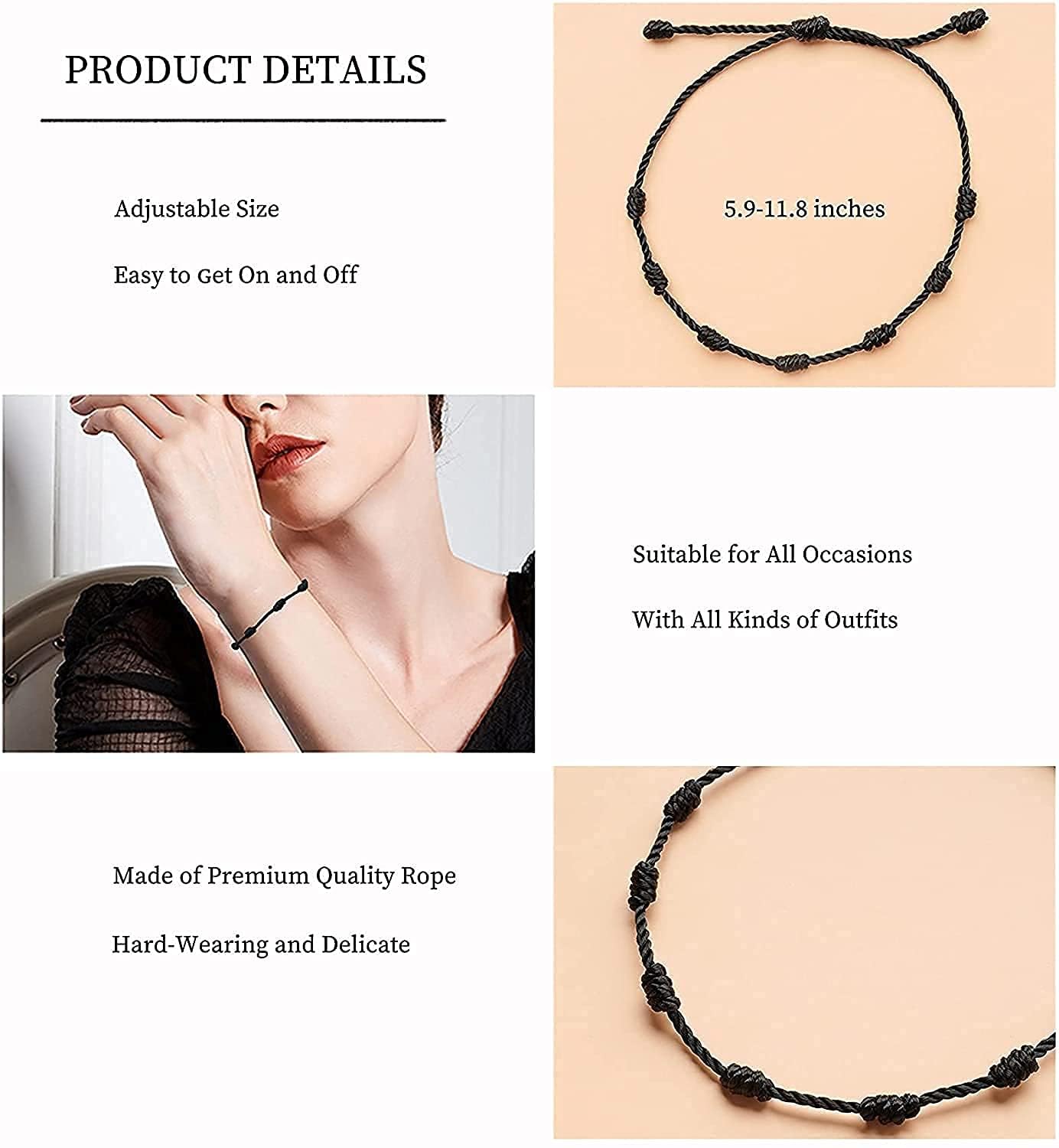 Meaningful good luck bracelet: This red rope bracelet is a good amulet a symbol of auspiciousness and happinessexpressing people's desire to expel bad luck and bring good luck and wealth to themselves. Handmade black bracelet: This Kabbalah red knot string bracelet is handmade so it is very hard-wearing and delicate and it will not exert burden on your wrist for its lightweight material. Adjustable size: The length of the rope can be adjusted according to the size of the wrist easy to wearso you don't have to worry about the bracelet coming off. 7 Knots string bracelet: Each bracelet designed with 9 knotsBright red is the most powerful color for warding off bad luck it will find favor with women and girls.