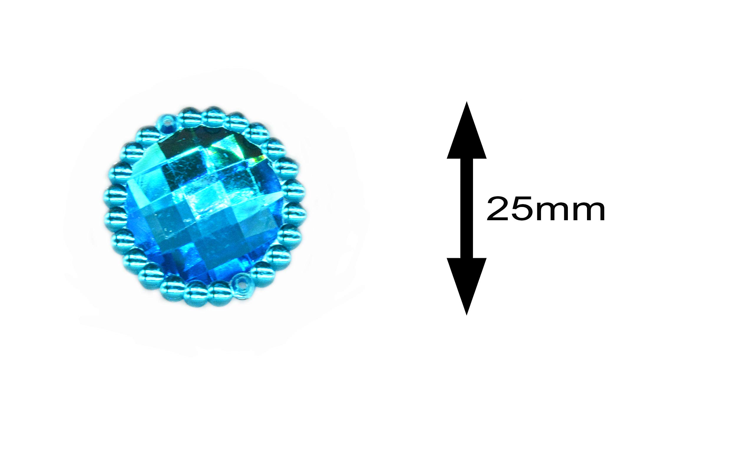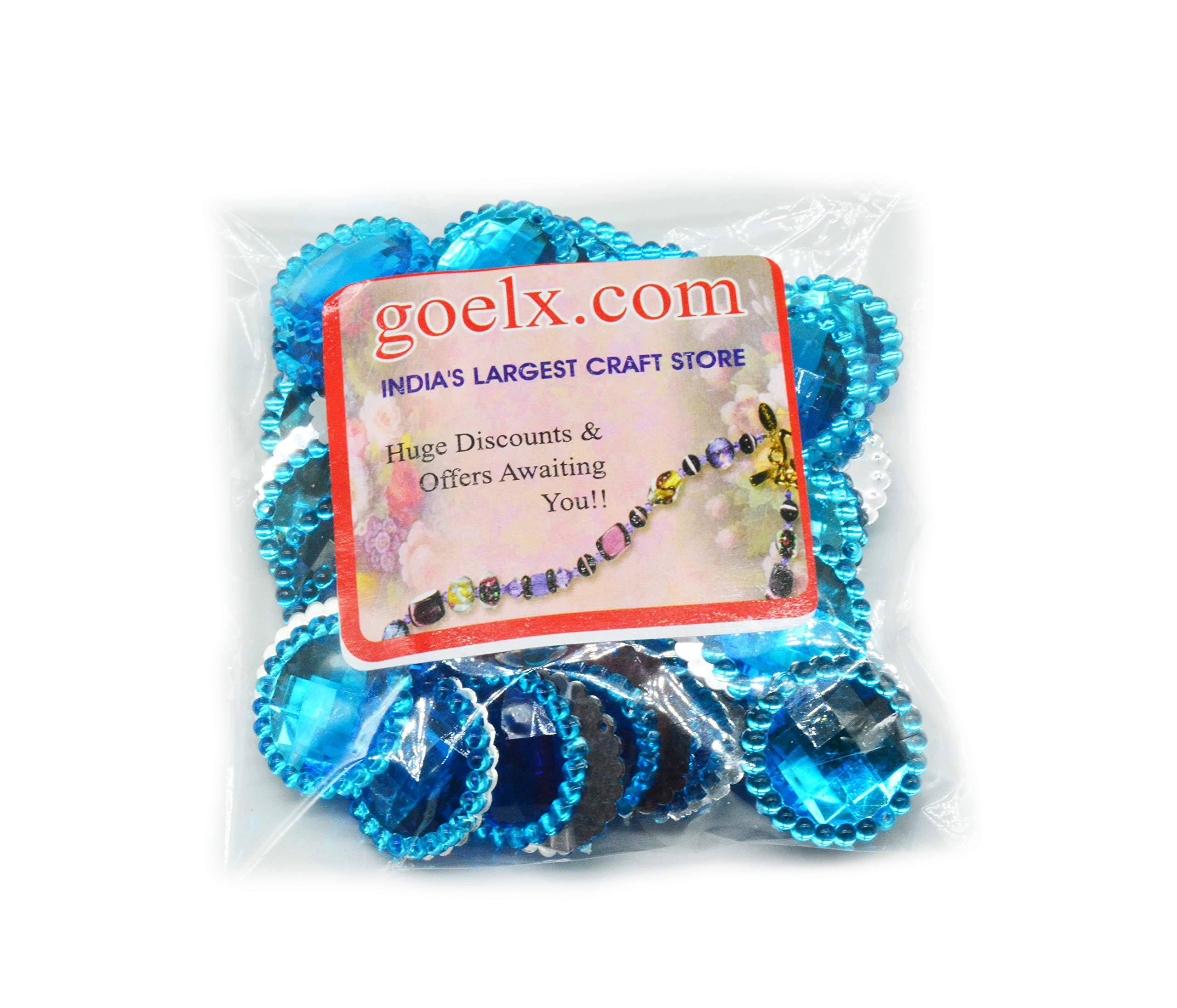 Goelx Sew On Glue On Rhinestone Embroidery Art & Craft Jewelry Making Crystal Embellishments in Turquoise Blue Colors - Size : 25 mm Pack of 50 PcsThese embellishments can be used to decorate Dresses Sarees Dupatta Hat Shoes Bag Costume and so on. Easy to use each has 2 holes so can be sewn onto clothes or stuck with glue. Faceted Gems will shine beautifully under sunshine and light. It is a DIY product that can be used for jewelry making embroidery sewing etc.These are acrylic available in Turquoise Blue colors. Pack Includes - 50 pieces Size : 25 mm
