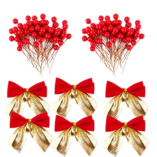 Forty Wings 50 Pcs Christmas Holi Berries and 6 Red Bows for Christmas Xmas Tree Decoration Wreath Making DIY Christmas Carft and Christmas Decoration Item