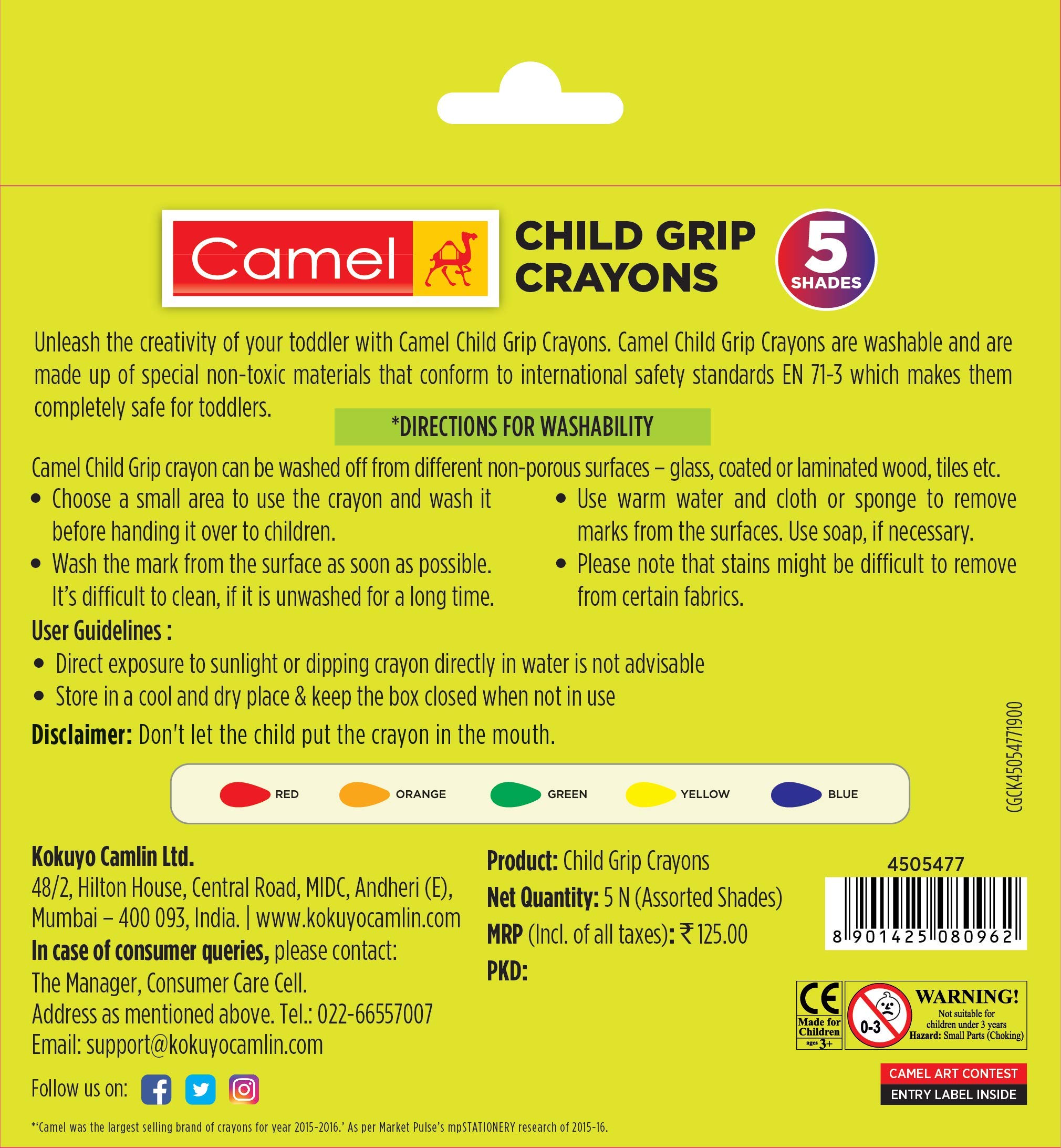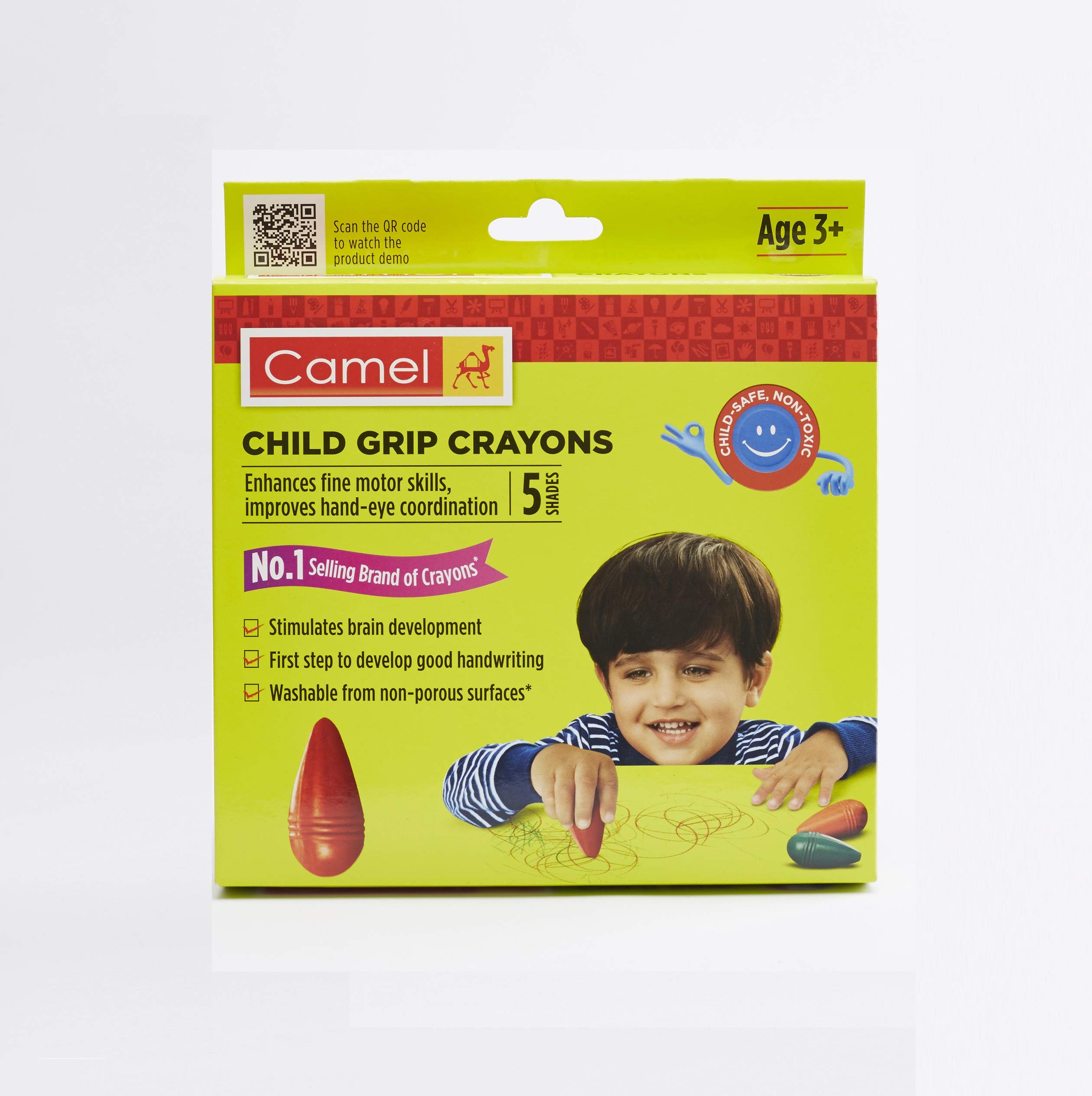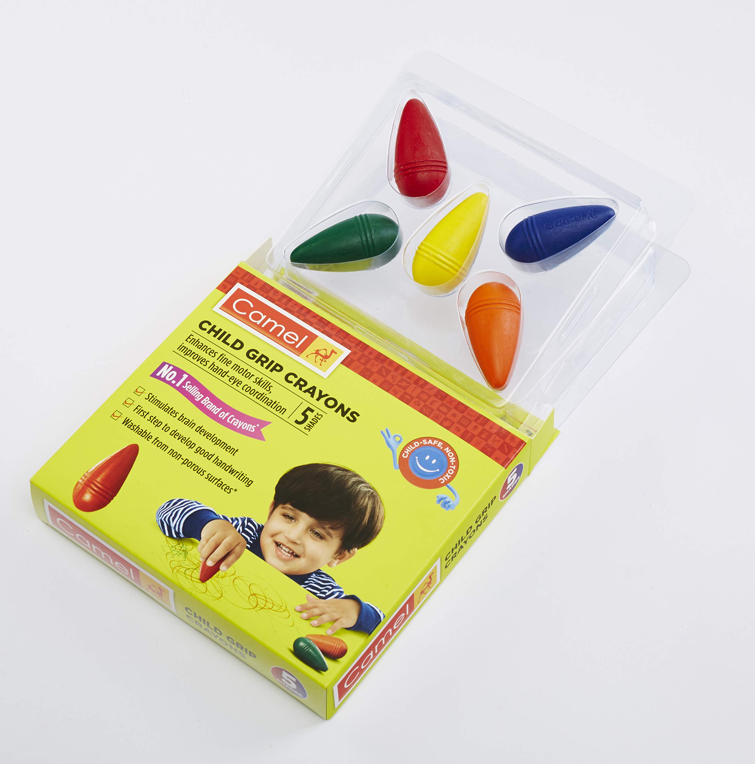 Unleash the creativity of your toddler with camel child grip crayons. Camel child grip crayons are washable and are made up of special non-toxic materials that conform to international safety standards EN 71-3 which makes them completely safe for toddlers.