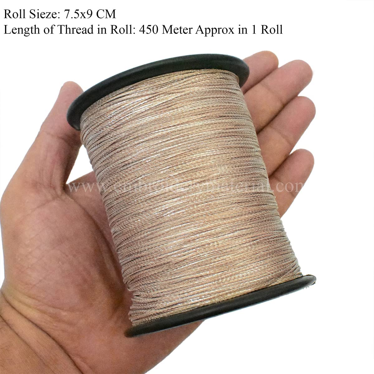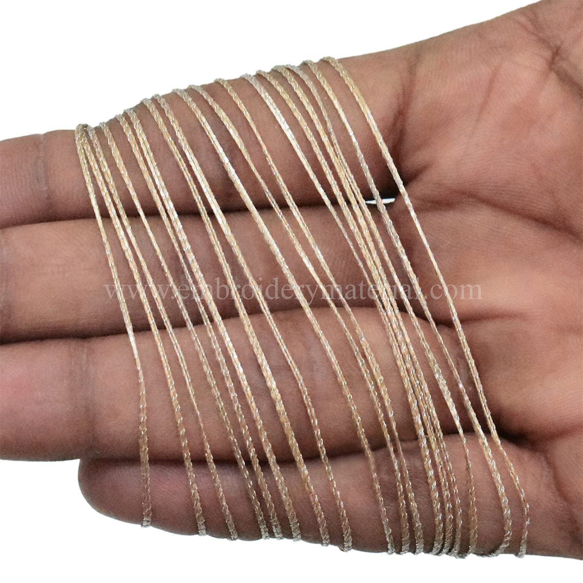 Add a touch of elegance and sophistication to your stitching projects with the EmbroideryMaterial Shining Twisted Metallic Zari Thread. This exquisite thread featuring a beautiful Peach and Silver color combination is perfect for enhancing your embroidery crochet and craft creations.Style: Handmade Variegated Twisted Metallic ThreadsColor: Peach / SilverFinish: ShiningMaterial: Polyester for metallic strip & Rayon yarn for inside threadDiameter of Thread: 0.75MMLength: Each Roll contains approximately 450 Meters of ThreadCrafted with precision this thread is made by wrapping a metallic polyester strip around a rayon thread using a hand power loom. Although it may feel slightly rough on hands the final zari thread boasts an amazing vintage royal shine once embroidered onto any fabric.Whether you're embellishing garments adding accents to crochet projects or enhancing your craft creations this twisted metallic zari thread in Peach and Silver will elevate your work with its shimmering beauty.