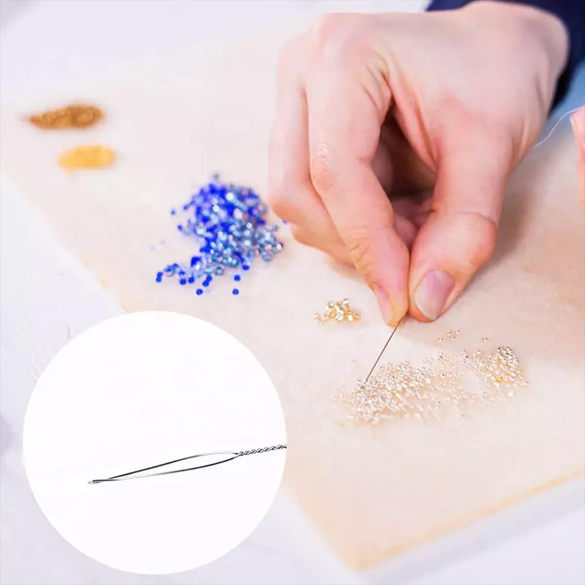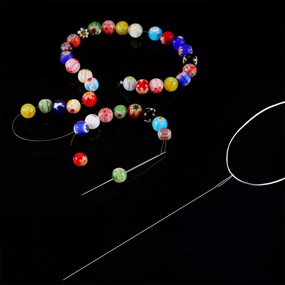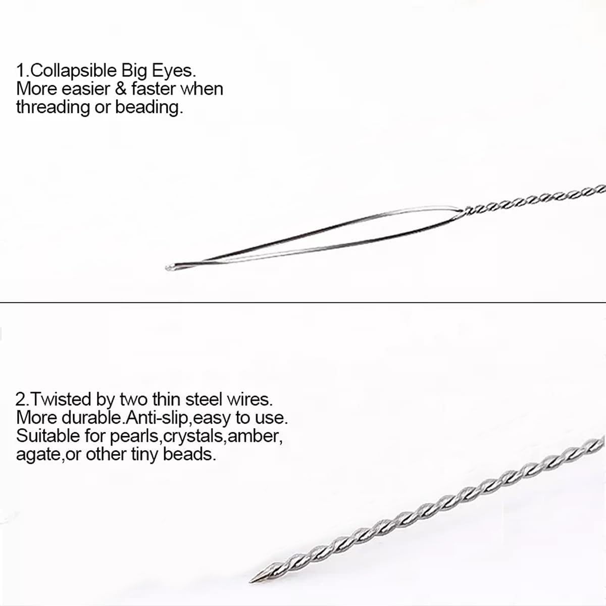 Product Detail: This needle is very flexible & strong which makes it ideal for stringing projects. Special steel wire has been used to make the eye of the needle which collapse when pass through any bead and then come back to its original shape when its pulled through the beads.