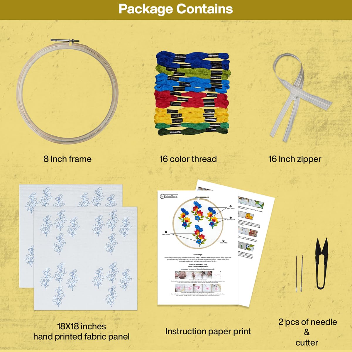 Complete DIY Embroidery Kit: This kit includes everything needed to create two stunning embroidered cushion covers featuring a tulip flower design. Each package contains 2 hand-printed fabric panels (18x18 inches) 2 plain fabric backing pieces an 8 embroi