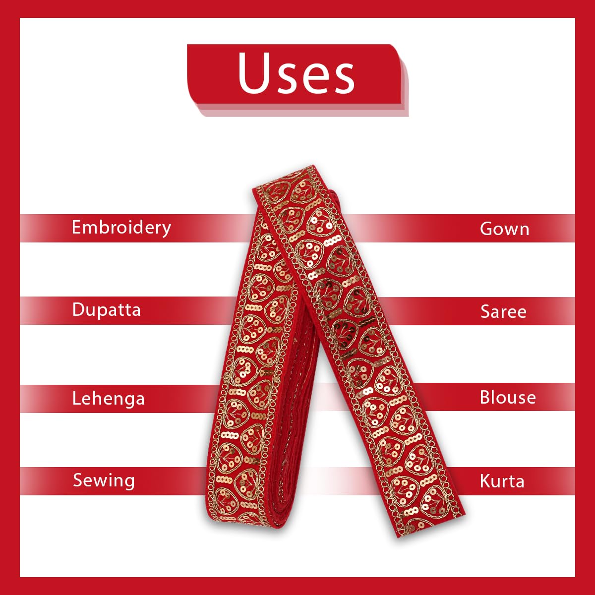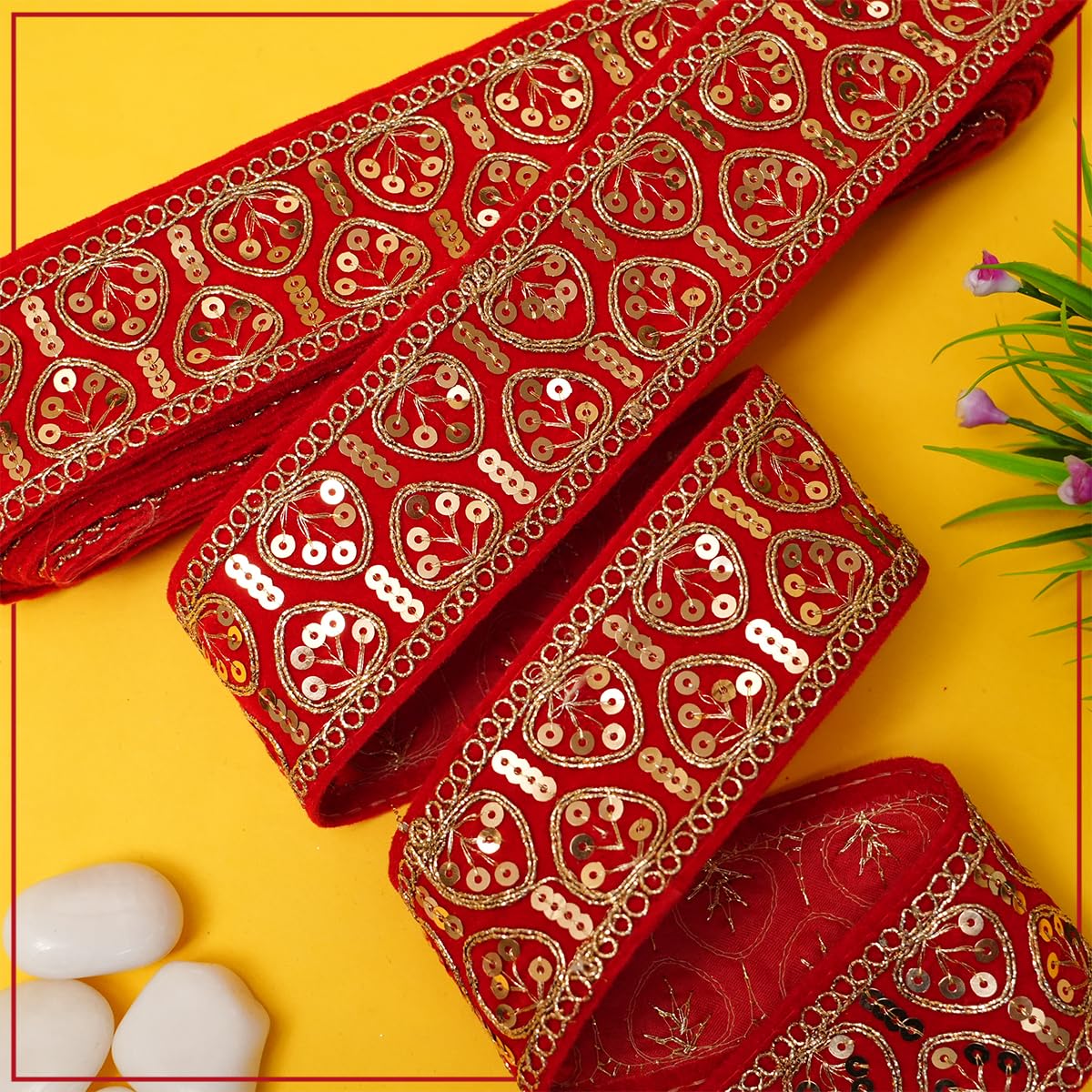This Velvet Lace with Golden Zari & Sequins is the perfect addition to your outfits and craft projects. Made from high-quality velvet this lace adds a touch of elegance and charm to any design. Measuring 5 cm wide and 8 Meterss long it provides plenty of material for various uses.The lace features a beautiful leaf pattern designed with golden zari and sequins. This intricate detailing gives it a rich luxurious look that's perfect for festive and wedding outfits. The vibrant red color makes it stand out whether you use it to decorate sarees lehengas or dupattas.Why Choose This Lace?For Traditional Outfits: Use this lace to add a stylish border to sarees lehengas dupattas or even kurtas. It's great for festive and wedding occasions where you want to look your best.For DIY Projects: This lace is perfect for creative projects like making home decor items wrapping gifts or embellishing accessories.High-Quality Design: The combination of velvet golden zari and sequins ensures a premium look that's both durable and beautiful.Easy to Use: The 8-Meters length gives you enough lace to complete larger projects or use it for multiple smaller designs.Where Can You Use This Lace?Clothing: Add it as a border to sarees lehengas or dupattas for an elegant traditional look.Home Decor: Use it to decorate cushions tablecloths curtains or other home accessories.Craft Projects: Perfect for handmade cards gift wrapping or adding a personal touch to your DIY crafts.With its bold red color and intricate golden detailing this velvet lace is ideal for anyone who loves traditional designs with a modern twist. Whether you're a fashion designer a craft enthusiast or someone looking to add something special to your outfits this lace is a great choice.
