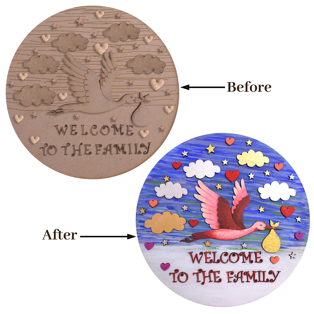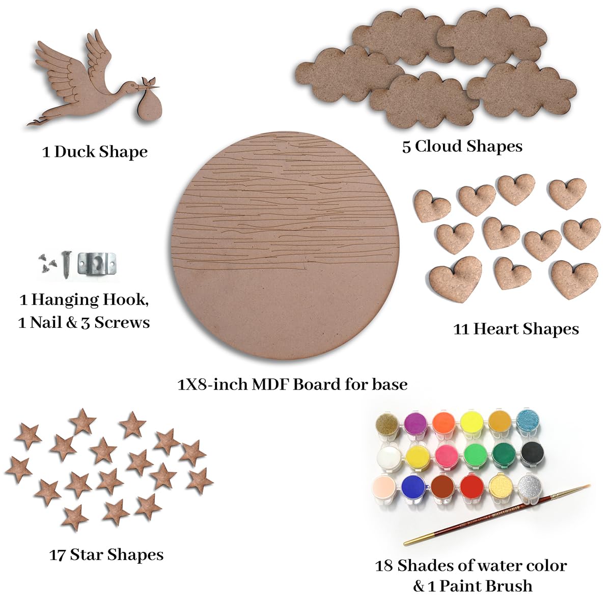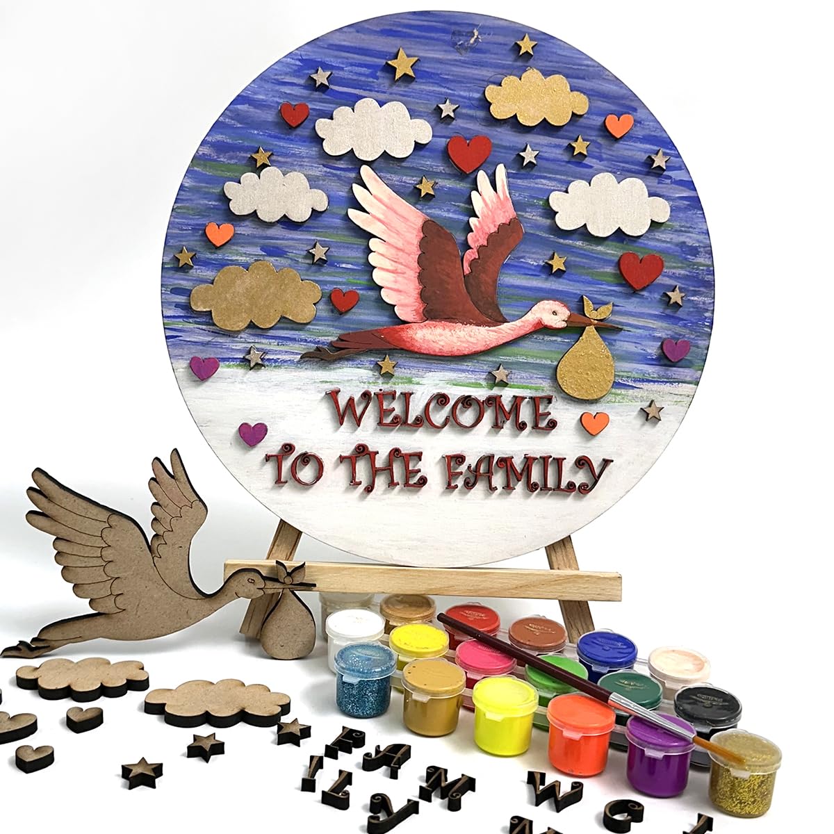 • Adorable Laser Cutouts: Personalize the artwork with a variety of charming laser cutouts including 5 clouds 17 stars 11 hearts individual alphabet letters to spell "Welcome to the Family" a cute little duck and a sturdy 8-inch MDF board as the canvas.