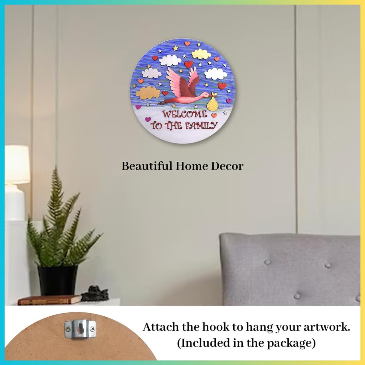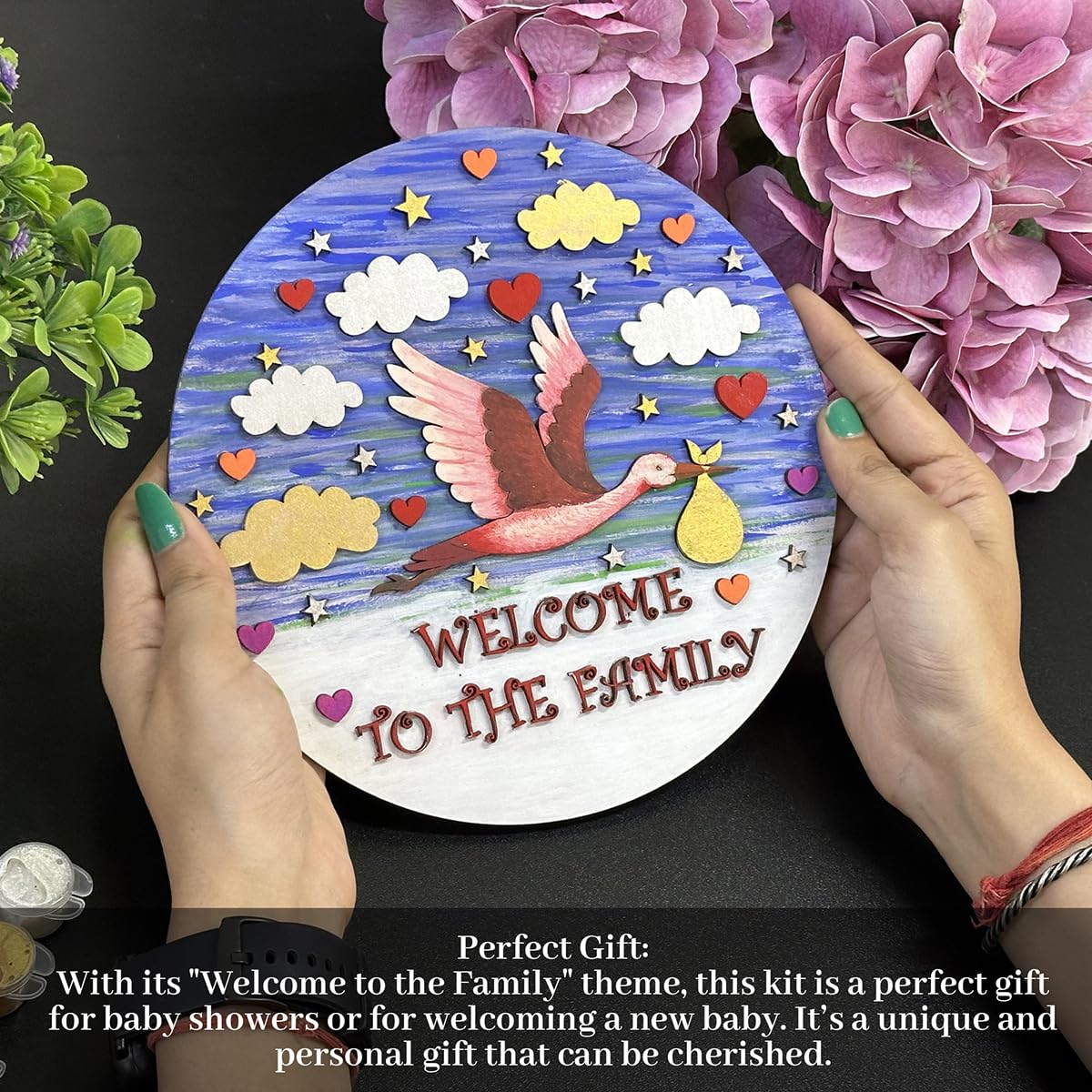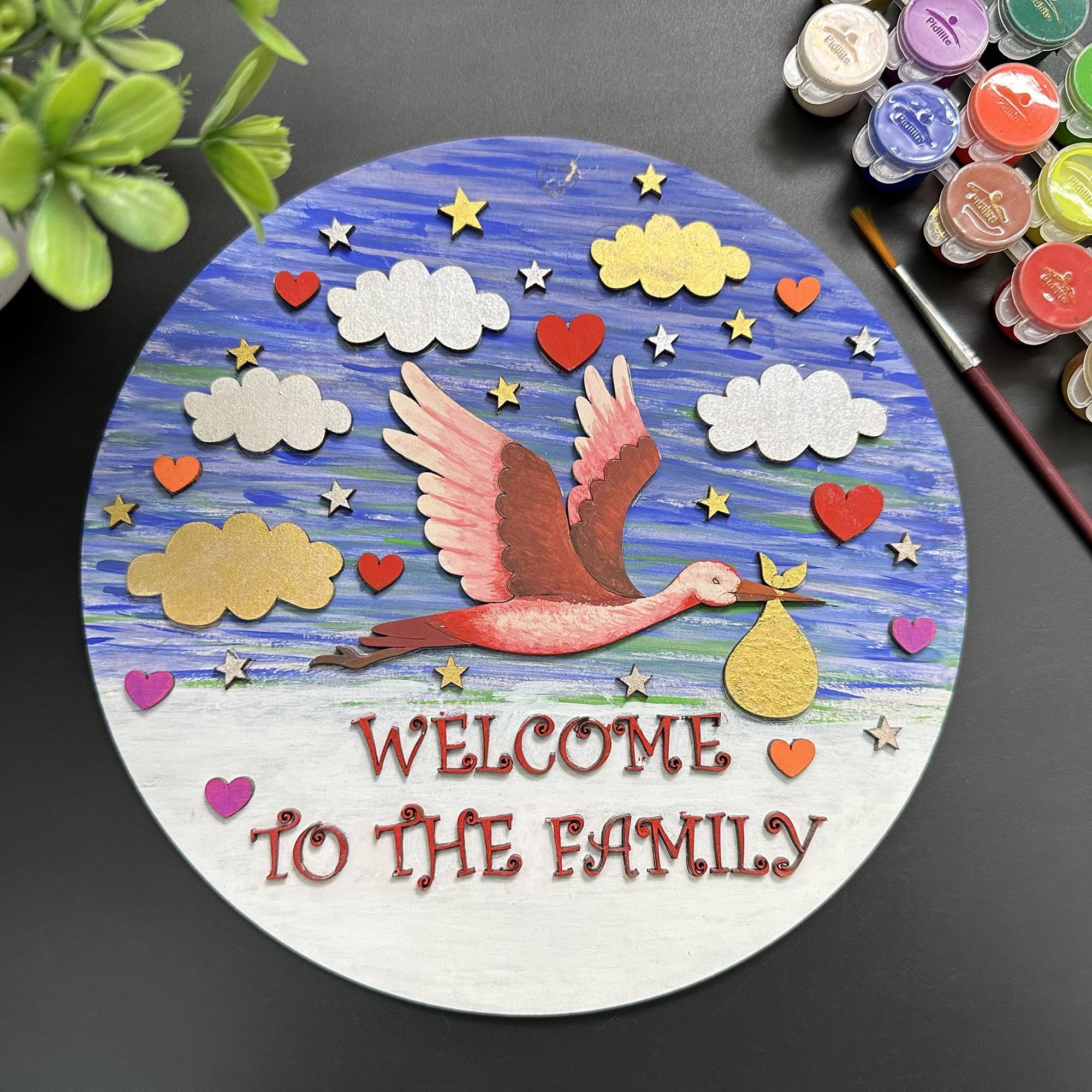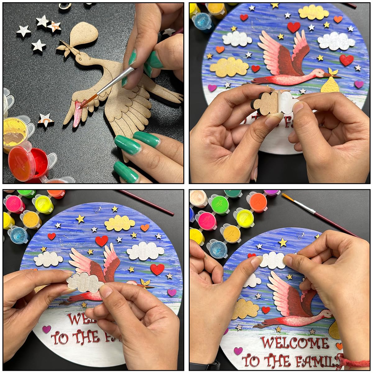 • Adorable Laser Cutouts: Personalize the artwork with a variety of charming laser cutouts including 5 clouds 17 stars 11 hearts individual alphabet letters to spell "Welcome to the Family" a cute little duck and a sturdy 8-inch MDF board as the canvas.