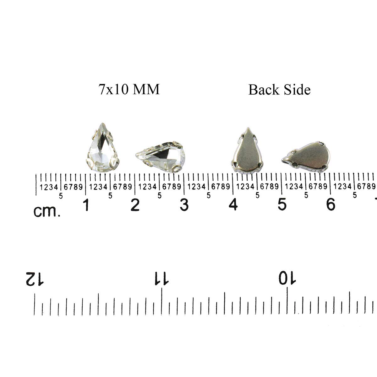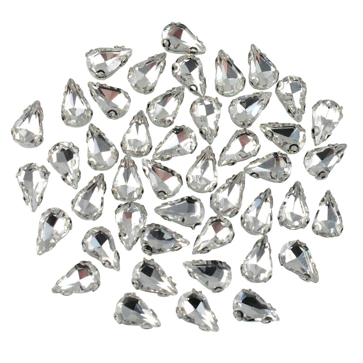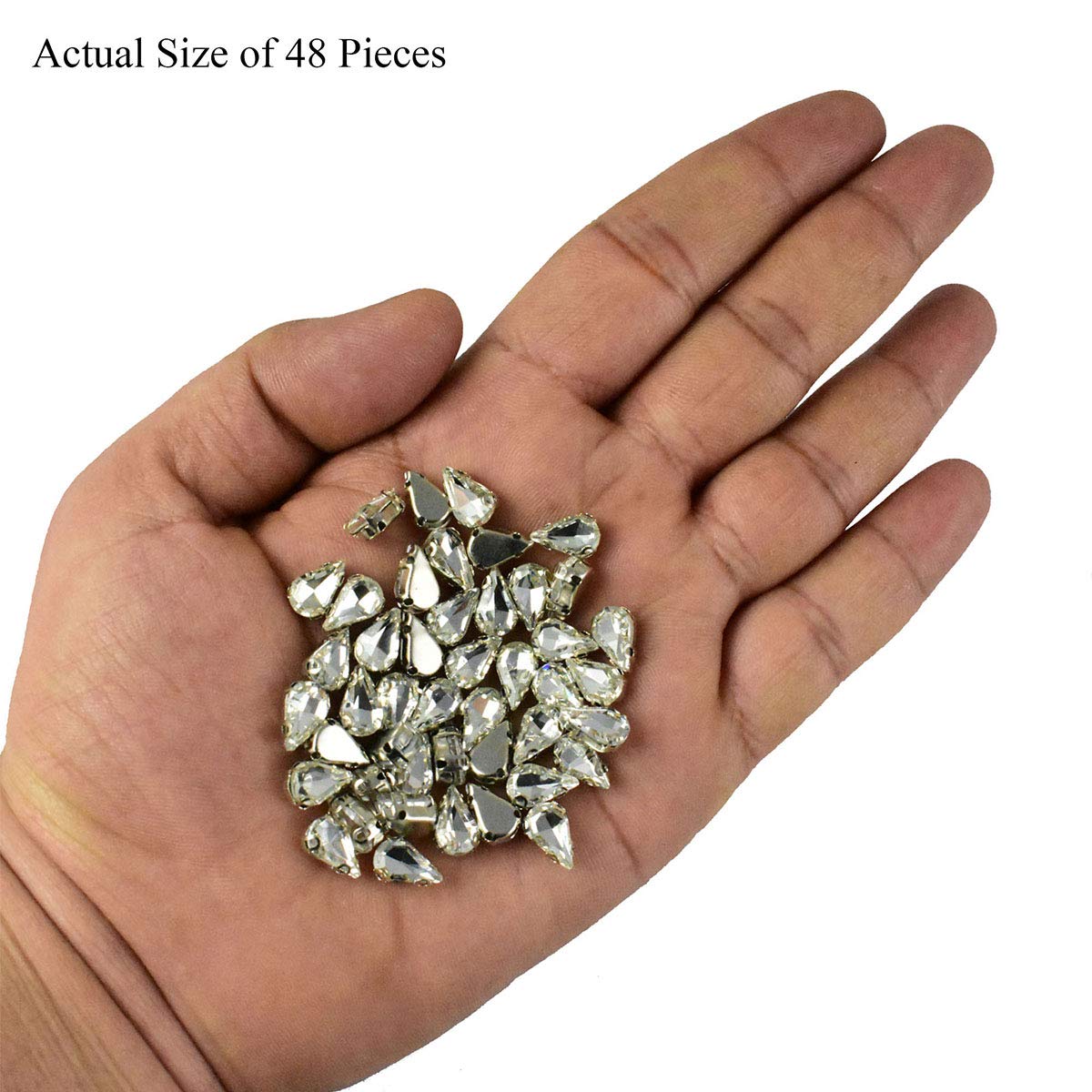 Elevate your craft and sewing projects with EmbroideryMaterial Sew on Glass Crystal Rhinestones. These premium-quality teardrop-shaped crystals also known as Paan Shape in India come with specially designed D-shaped claws that securely hold the crystals without damaging the fabric. Perfect for adding a touch of elegance to gowns sarees and other couture wear these multifaceted glass crystals feature a fine foil coating that maximizes light reflection creating a dazzling effect. Ideal for fabric embellishment jewelry making and various craft projects these rhinestones are a must-have for any DIY enthusiast.Product Specifications:Style: Sew on Glass Crystal Stone with D Shape ClawsMaterial:Stone: Crystal-GlassHolder/Catcher: BrassColor: SilverSize: 7*10 MMShape: Teardrop (Paan Shape)Package Content: Pack of 48 Pieces Sew on Glass Crystals