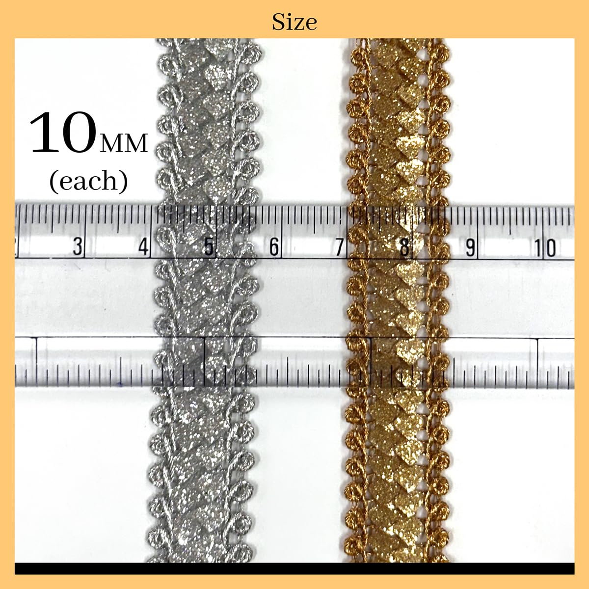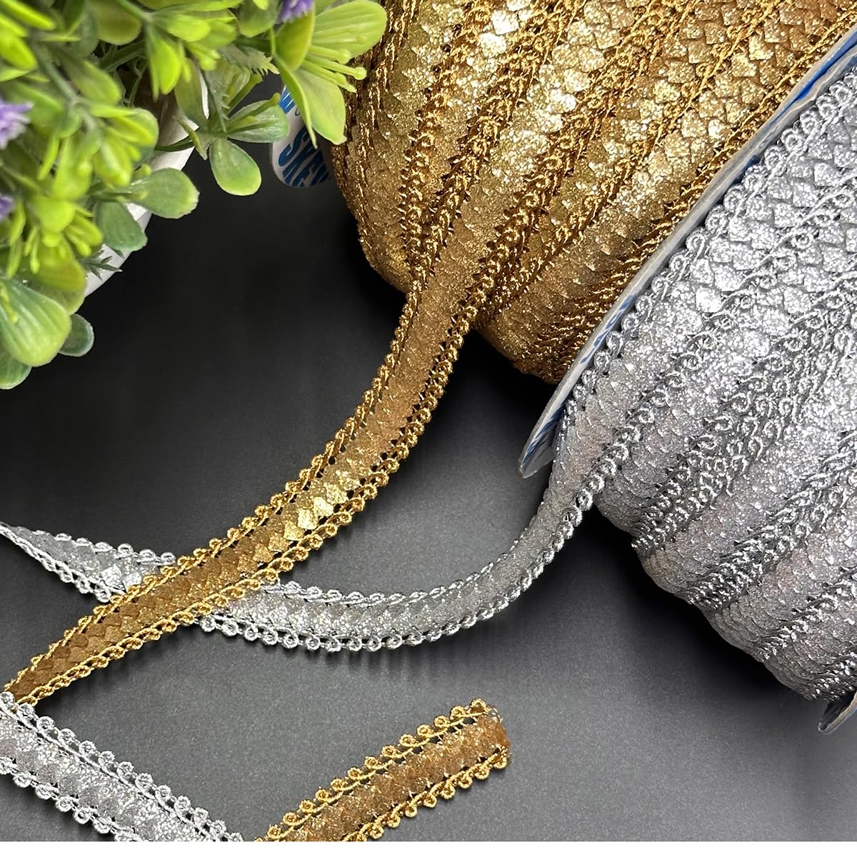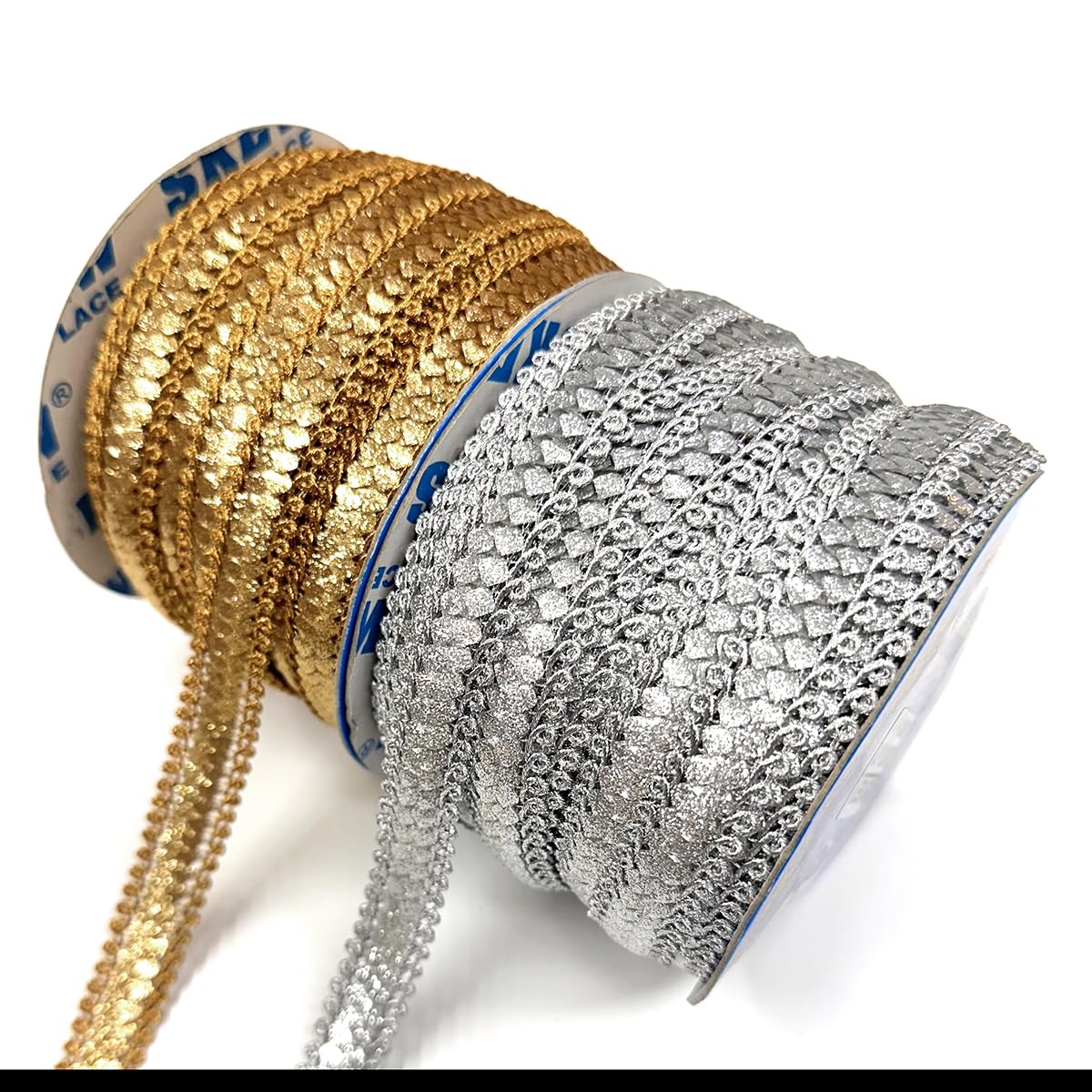 Shiny Gold & Silver Zari Border Lace Combo: Stay ahead of trends with this contemporary combo pack featuring sophisticated Gold and classic Silver Zari Laces each adorned with a shiny zari design.