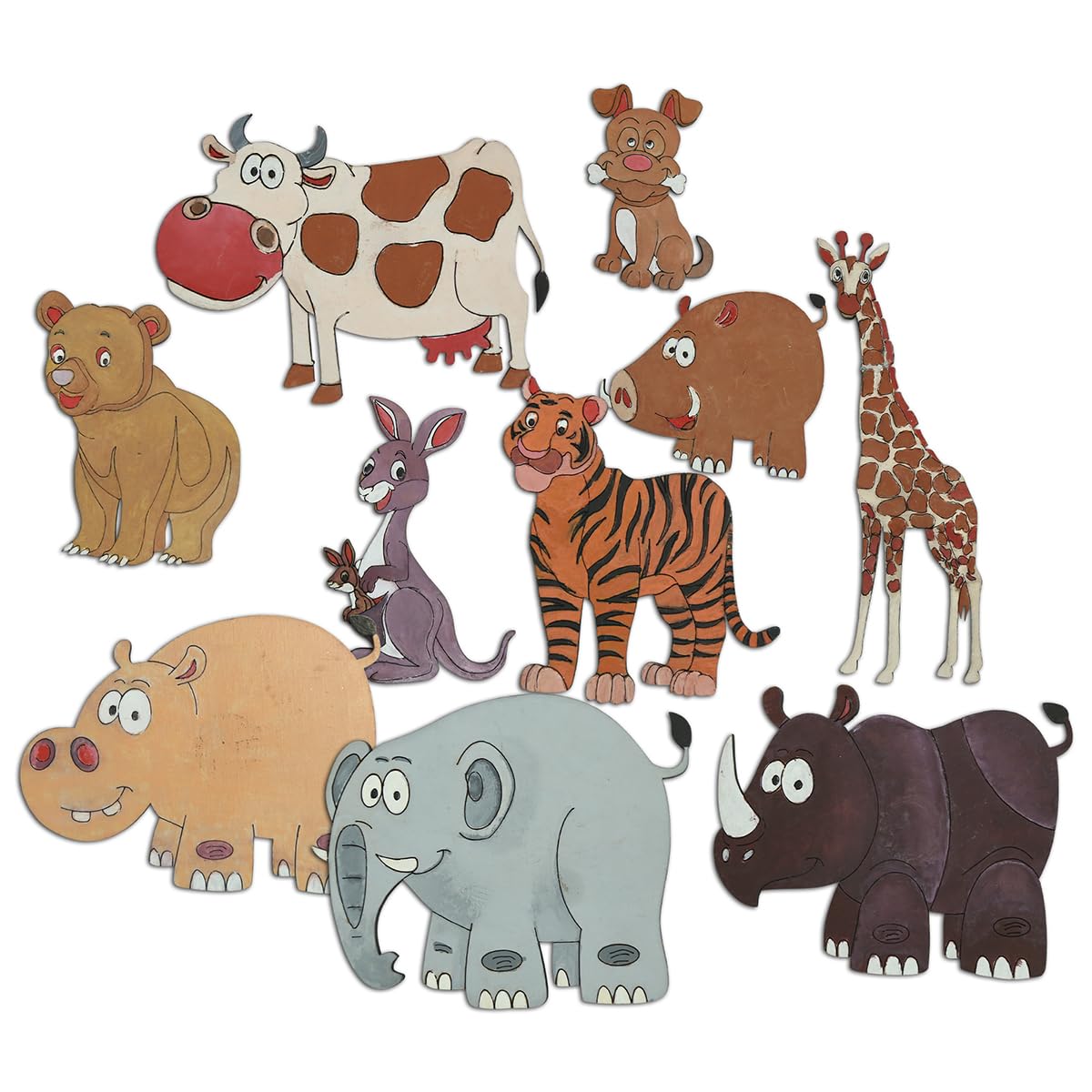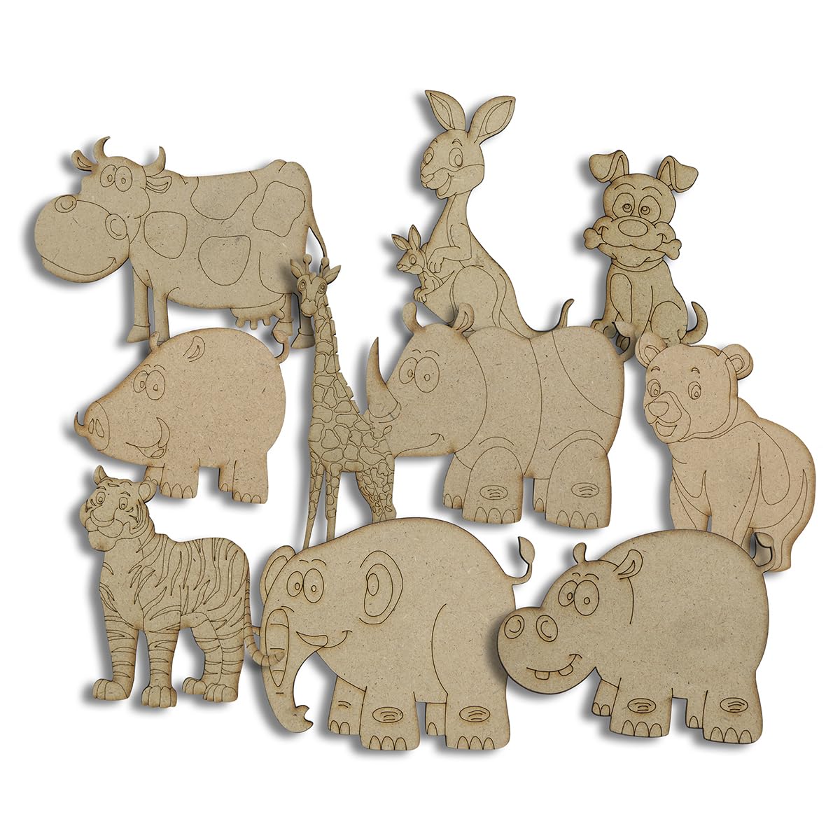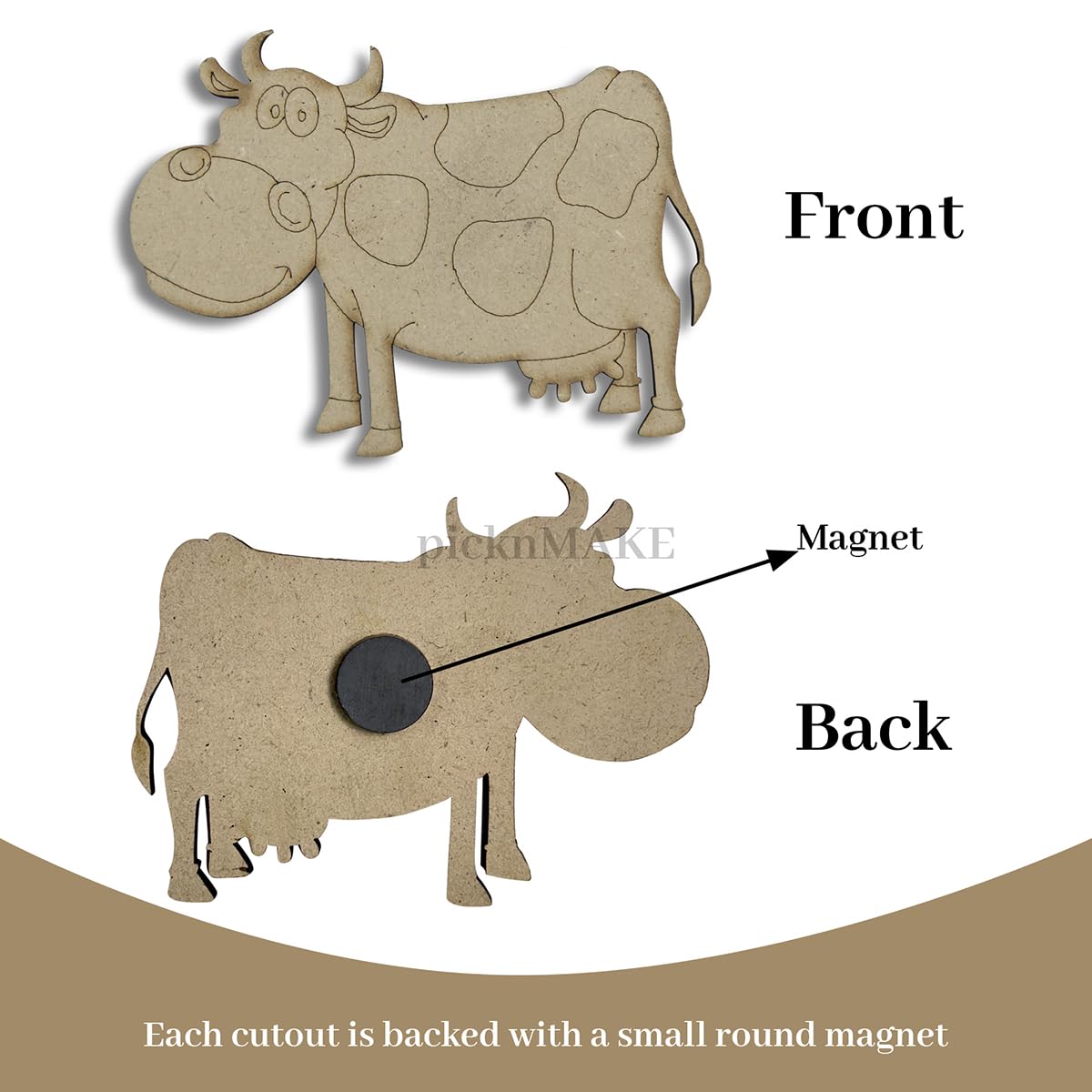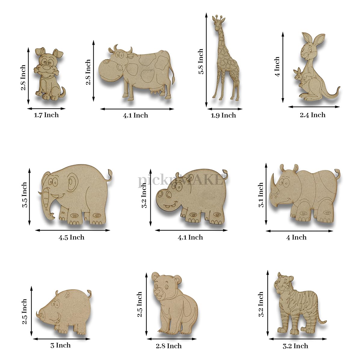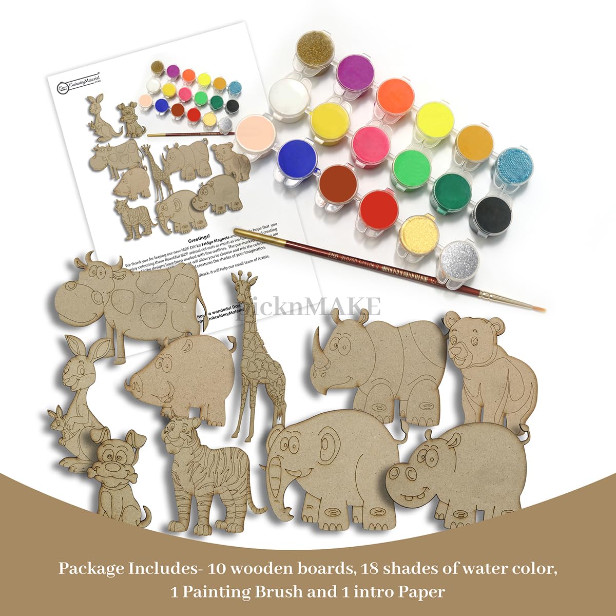 Introducing our picknMAKE Fridge Magnets - the perfect blend of functionality and style to elevate your home kitchen or office decor! Crafted with love and attention to detail this set of 10 cute animal designs adds a delightful touch to any magnetic surface.Each magnet features a unique animal design meticulously crafted to bring charm and personality to your space. From adorable dogs to majestic elephants quirky pigs to fierce tigers there's a magnet for every animal lover in this set.Here's what you'll find in the pack:Dog (2.8 inch x 1.7 inch)Cow (2.8 inch x 4.1 inch)Giraffe (5.8 inch x 1.9 inch)Kangaroo (4 inch x 2.4 inch)Elephant (3.5 inch x 4.5 inch)Hippo (3.2 inch x 4.1 inch)Rhino (3.1 inch x 4 inch)Pig (2.5 inch x 3 inch)Bear (2.5 inch x 2.8 inch)Tiger (3.2 inch x 3.2 inch)Each magnet is mounted on sturdy MDF boards ensuring durability and longevity. The small round magnets attached to the back of each board provide a strong grip on any magnetic surface keeping your favorite animals securely in place.But here's where the fun truly begins - these magnets aren't just for display! They double as a customizable craft activity. Included in the package are vibrant colors and a brush allowing you to unleash your creativity and personalize each magnet according to your taste. Whether you prefer a classic look or a splash of vibrant hues the choice is yours!Ideal for both adults and children our picknMAKE Fridge Magnets offer endless possibilities for decorating your refrigerator whiteboard or any other magnetic surface. Add a touch of whimsy to your space and let your imagination run wild with these delightful animal magnets.
