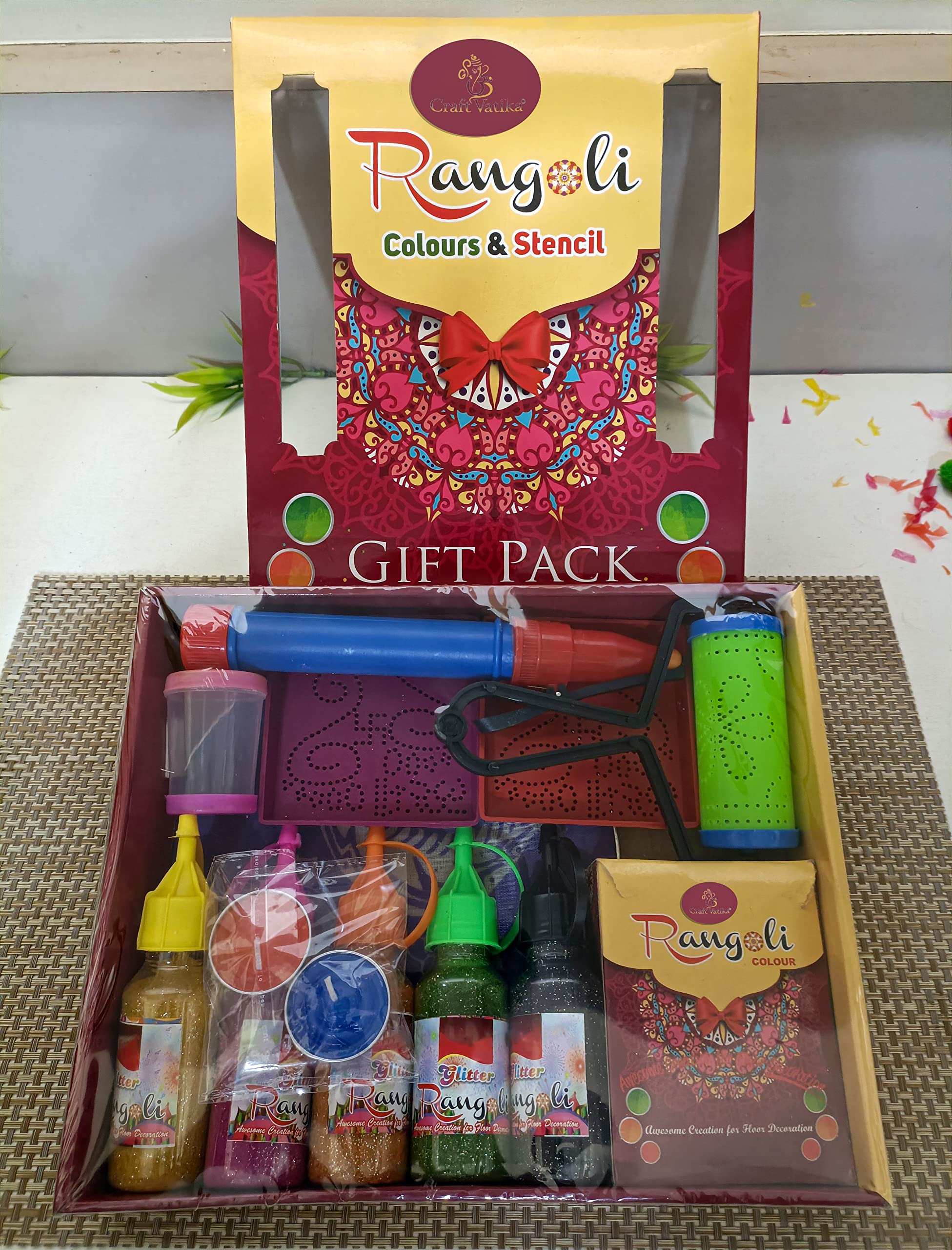 HomeArt & CraftRangoli ArtComplete Rangoli Making Kit Tools Gift Pack of Rangoli Colour Powder Bottle Stencil with Candle Diya for Diwali Decoration Items Floor Art Rang for Home Pongal Pooja Decor.