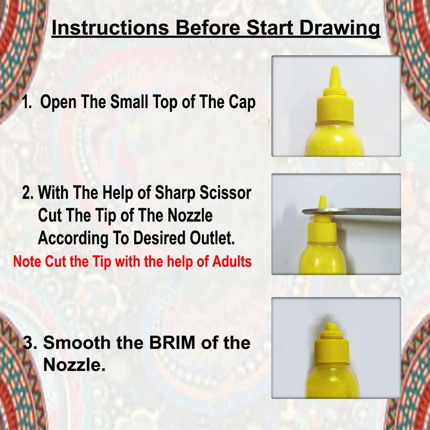 Rangaoli Package Contain: Set of 10 Multicolour Rangoli color bottles .Quantity : Approx 85 Grams each (850 Grams Total). HOW TO USE:Follow Instructions on the Box packing Please cut Front nozzle with knife. If you need larger hole please cut more than 70