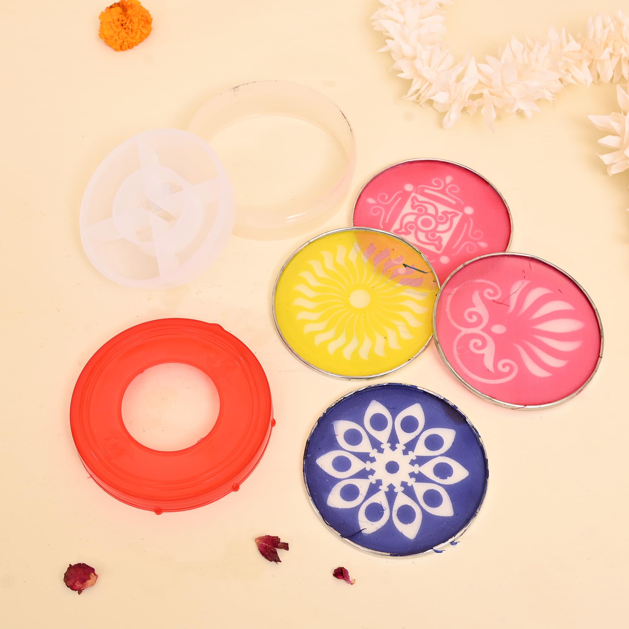 Rangaoli Package Contain: Set of 4 Multicolour Rangoli color Powder Pouches with 4 Stencil and 1 Magic Rangoli Maker .It is usually made during diwali (Deepawali) wedding onam pongal and other indian festivals. . Colour is made of sawdust. These colors are eco friendly. rangoli is a native of indian culture and is used in every festive occasion to decorate one's house. These colors spread positive vibrations within the environment and make to lively and entertaining.it also signify a warm welcome for visitors. Many traditionalists also believe that drawing of rangolis on the floor near the main doorway of the house warded off evil spirits..