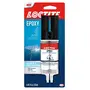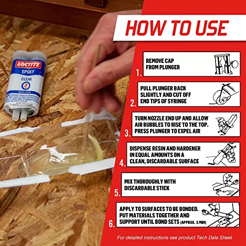 Loctite Epoxy Clearâ Multi-Purpose is a two-part adhesive consisting of an epoxy resin and a hardener. When mixed in equal volumes the resin and hardener react to produce a tough rigid high strength bond in 5 minutes for most projects. Available in a convenient dual syringe which delivers equal parts of both components every time. Epoxy Clear Multi-Purpose can be used as an adhesive for a wide range of materials or as a versatile filler for gap filling surface repairs and laminating. It does not shrink and is resistant to water and most common solvents. Product dries clear making it perfect for transparent repairs or jobs that require invisible seams. It can be tinted with earth pigments cement or sand for color matching and can be sanded and drilled.