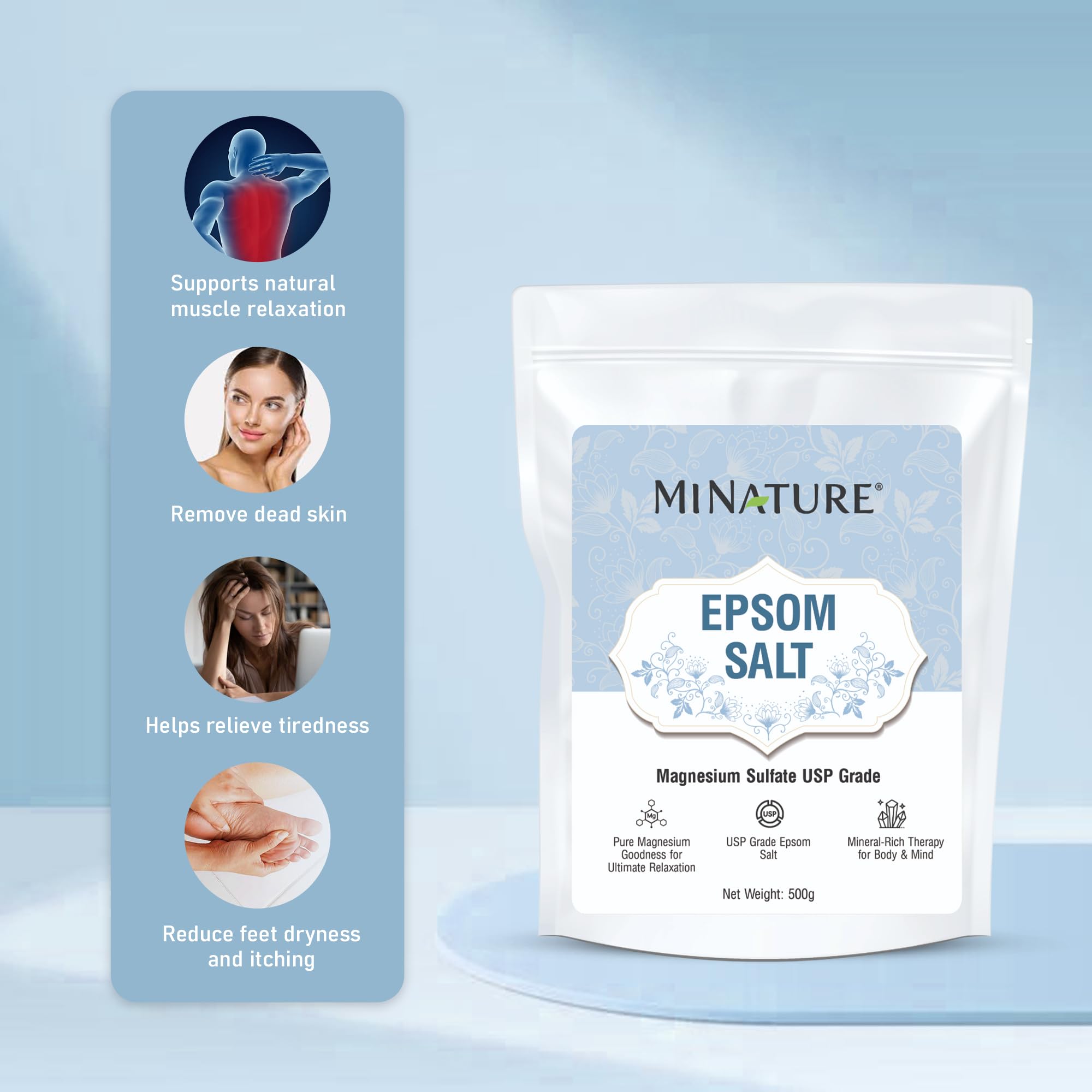 Mi Nature Premium Epsom SaltUSP Grade Magnesium Sulfate | 100% Pure | 500g (17.6 oz)About Mi Nature Epsom SaltExperience the exceptional quality of Mi Nature's 100% pure Epsom Salt (Magnesium Sulfate). Our premium USP Grade formula provides 500g of fine crystalline mineral that dissolves easily in water for maximum effectiveness. This versatile natural mineral has been trusted for centuries to support muscle comfort skin appearance and plant health.Superior Quality PromiseUSP Grade Certified:Meets USP standards for purity and qualityLaboratory Verified: Each batch tested for consistent quality and purity100% Pure Mineral: Contains only pure Magnesium Sulfate with no additivesFine Crystal Structure: Dissolves quickly and completely in waterCarefully Packaged: Sealed to maintain freshness and prevent moisture absorptionThe Mi Nature DifferenceFor years Mi Nature has delivered premium natural products that combine traditional wisdom with modern quality standards. Our Epsom Salt undergoes rigorous testing for purity and effectiveness before reaching your hands. We take pride in offering genuine high-quality natural products that meet the highest standards.Multiple Uses for Mi Nature Epsom SaltFor Bath Soaking:Add 1-2 cups (250-500g) of Epsom Salt to a standard-sized warm bathDissolve completely in the water before enteringSoak for 15-20 minutes to allow the magnesium to work effectivelyFor best results use 2-3 times weekly for muscle comfortFor Foot Soaking:Dissolve ½ cup (125g) in a basin of warm waterSoak feet for 15-20 minutesGently towel dry and follow with moisturizerIdeal for relaxation after a long dayFor Garden & Plants:For general soil improvement: Mix 1 tablespoon per gallon of water and water plants monthlyFor roses and tomatoes: Sprinkle 1 tablespoon around the base of plants before wateringFor lawn care: Dissolve 2 cups in water using a sprayer per 1000 square feetFor potted plants: Add 1 teaspoon to 1 gallon of water once a monthFor Exfoliation:Mix a handful of Epsom Salt with your favorite body wash or olive oilGently massage on wet skin using circular motionsRinse thoroughly with warm waterFollow with moisturizer for smooth refreshed skinKey BenefitsMuscle Comfort: Helps ease tired muscles after physical activityRelaxation Support: Creates a calming bath experience for unwindingSkin Appearance: Gentle exfoliation for smoother-looking skinFoot Comfort: Soaking solution for tired feetPlant Nourishment: Provides magnesium and sulfur essential nutrients for plant growthVersatile Uses: One product for personal care and gardening applicationsStorage RecommendationsStore in a cool dry place away from direct sunlight. Keep container tightly sealed to prevent moisture absorption. For maximum effectiveness use within 36 months of purchase.Experience the natural goodness of pure Epsom Salt with Mi Nature - Where Quality Meets Nature