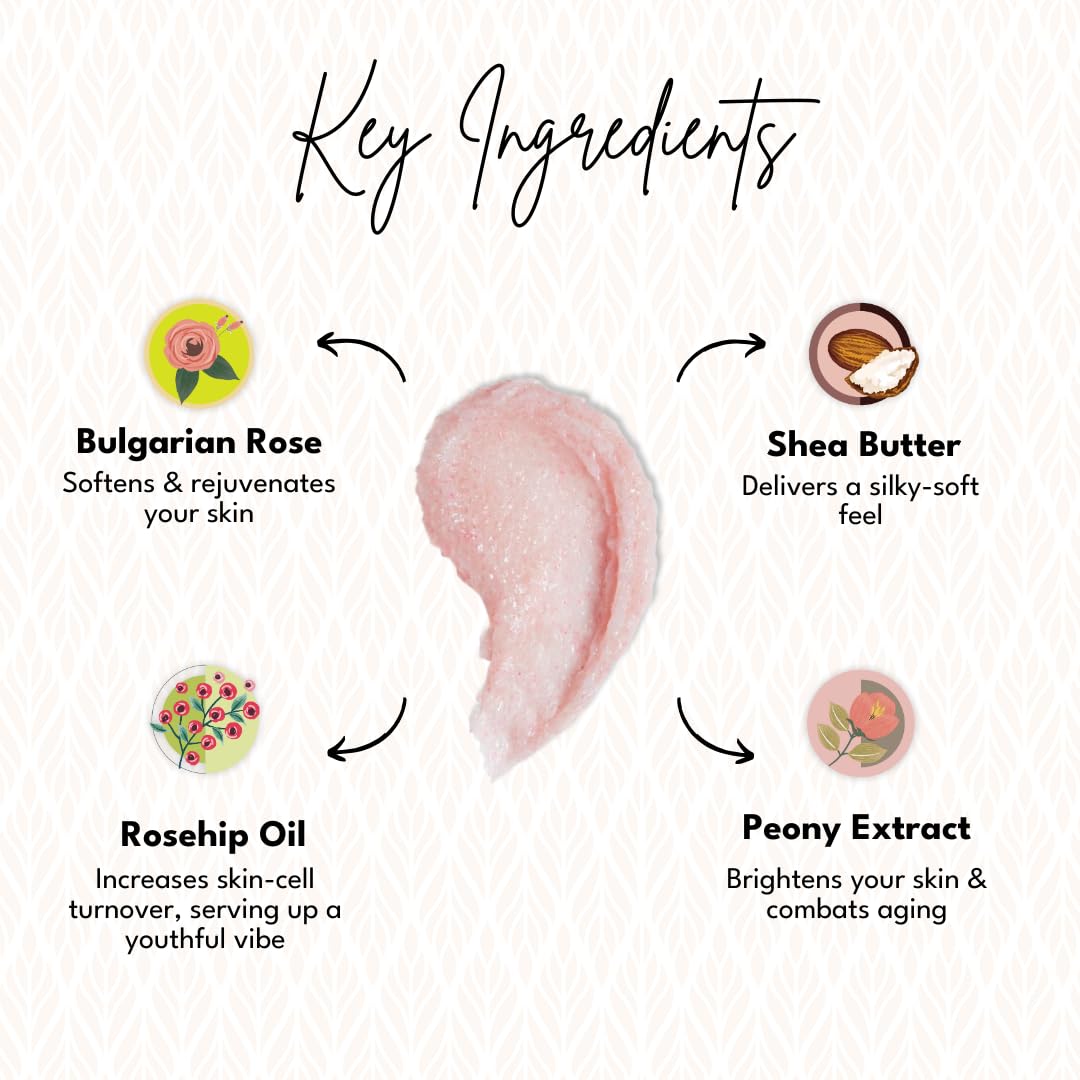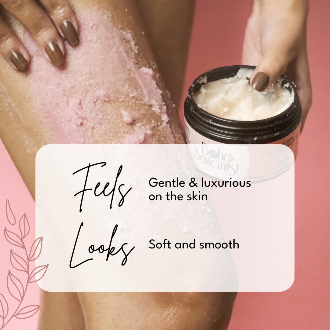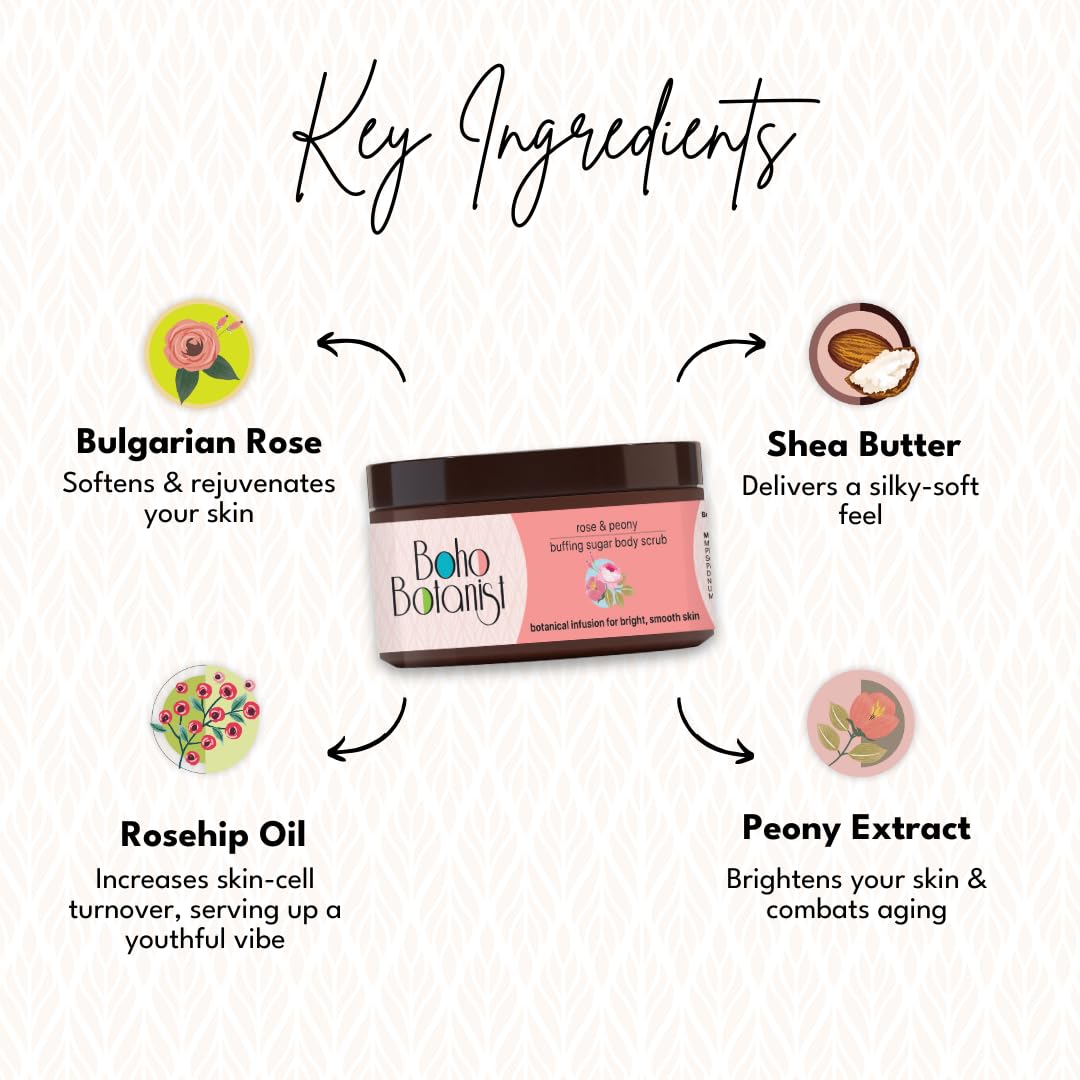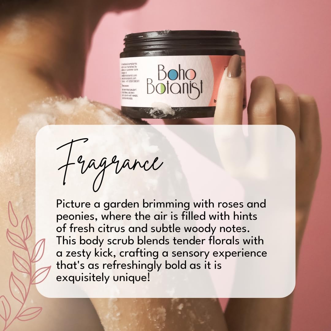 Boho Botanist Rose & Peony Sugar Body Scrub (200 gm) | Tan Removal Anti-Aging & Pigmentation Reduction | Smooth & Glowing Skin | Suitable for All Skin Types Men & Women