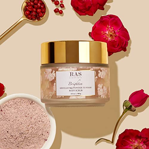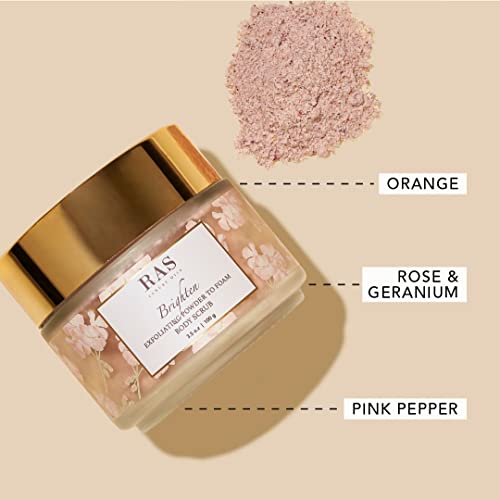 RAS Luxury Oils Brighten Exfoliating Powder to Foam Body Scrub | Tan Removing & Gentle Exfoliation | Orange, Himalayan Rose & Pink Pepper | For Men & Women | Vegan, Toxin & Cruelty Free | 100g