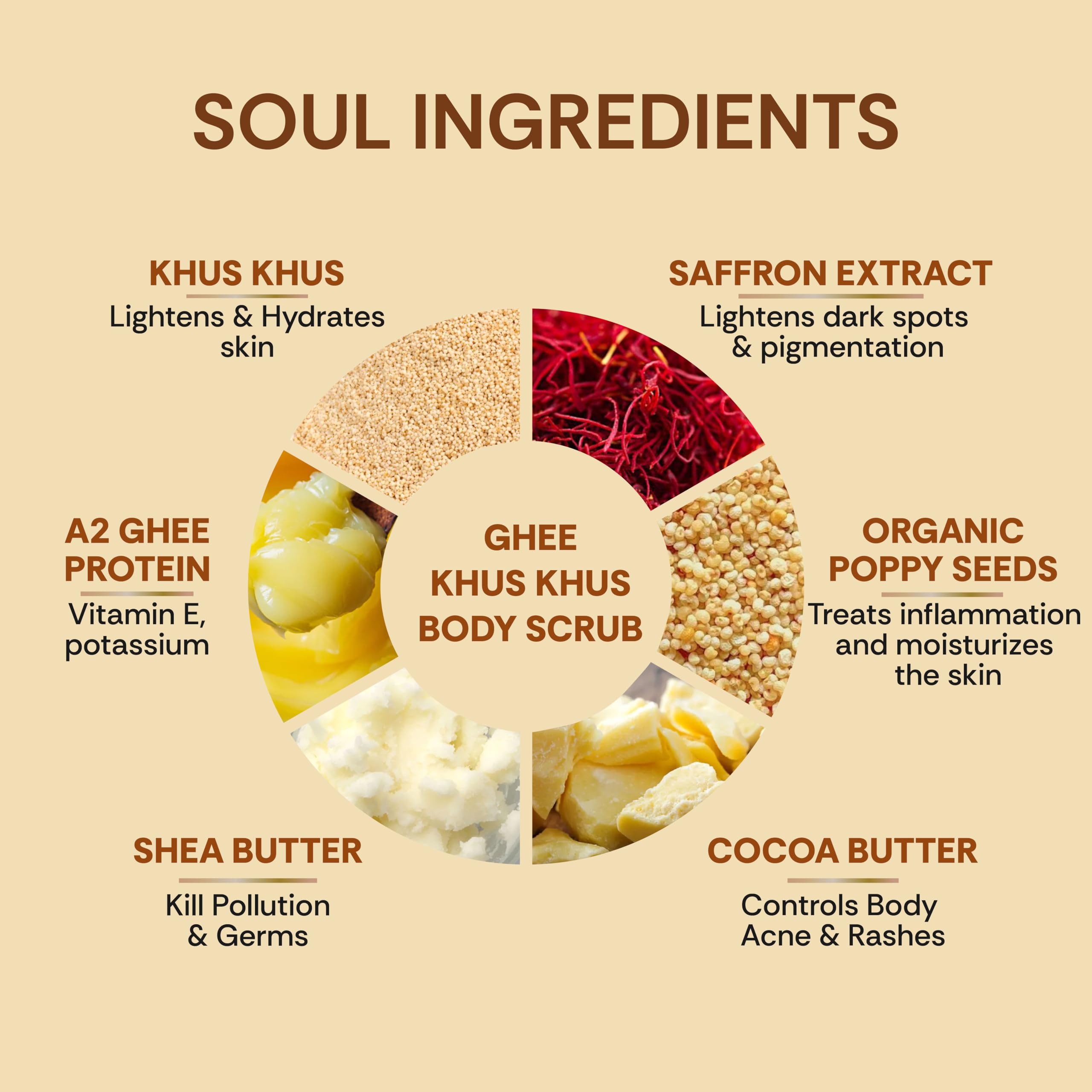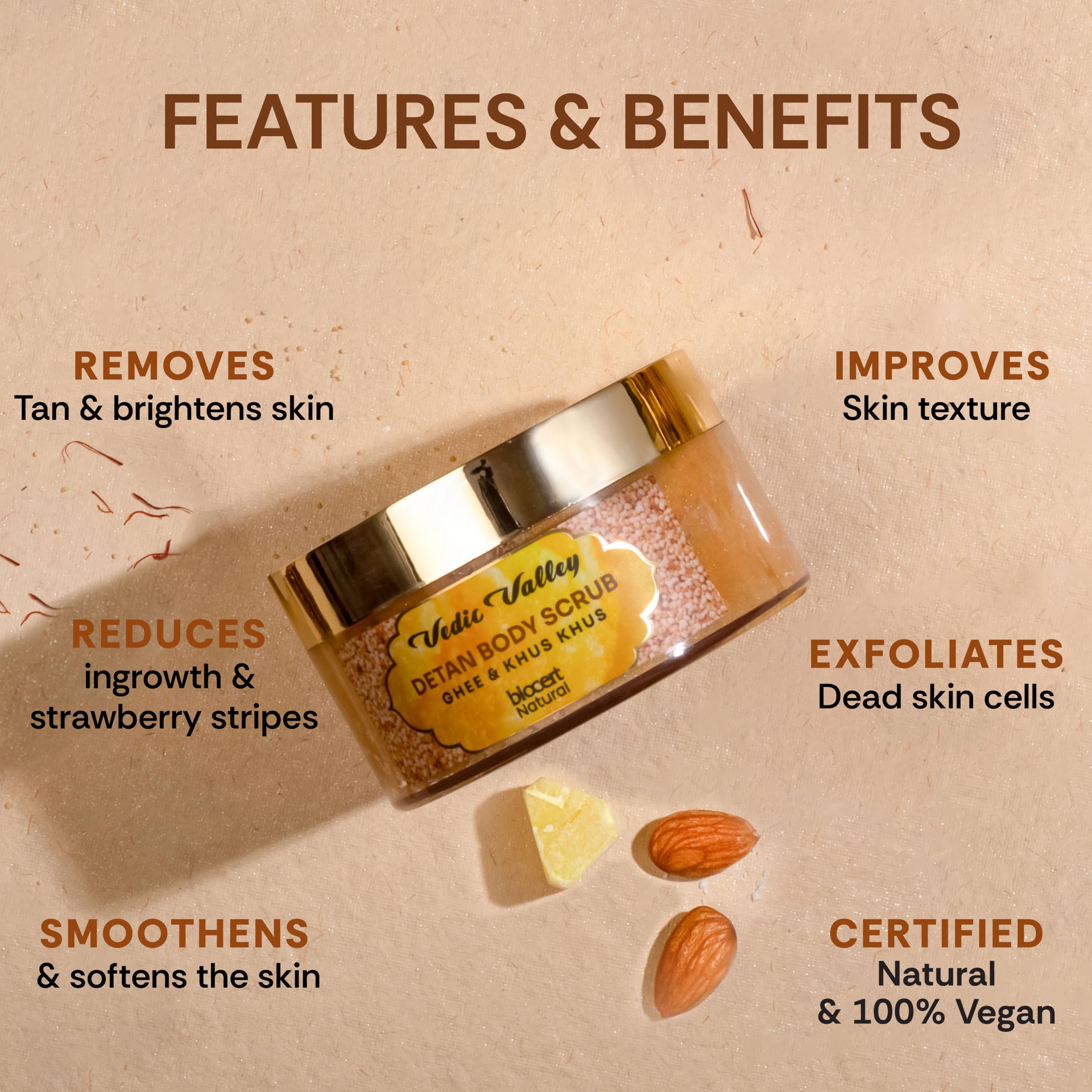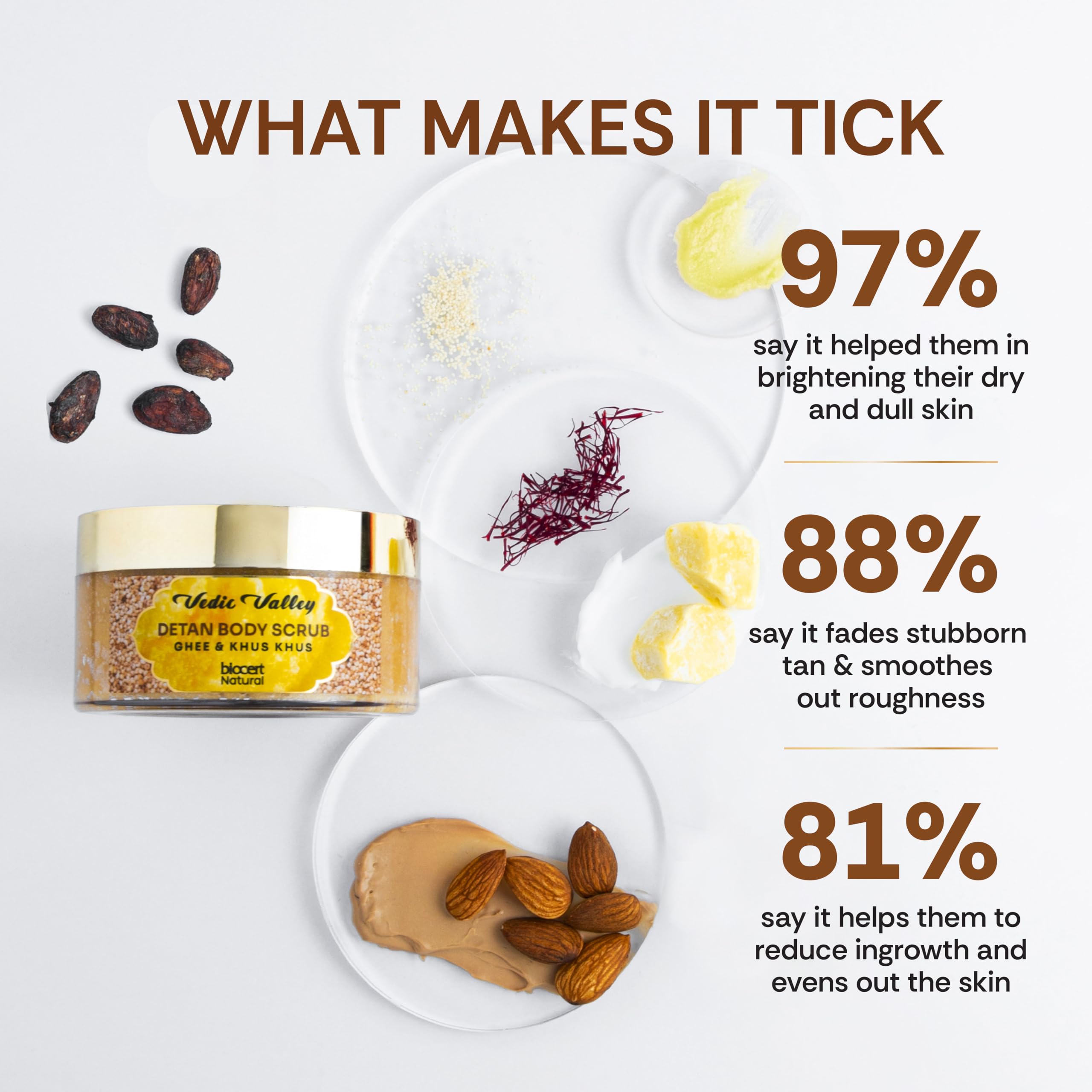 Vedic Valley Ayurvedic Detan Ghee Khus Khus body Scrub with Organic Actives | Removes Dirt & Dead Skin from Neck Knees Elbows & Arms | Skin Brightening & Exfoliating Scrub For Men & Women | 250 gm