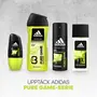 The true sport brand for men and women offering the best and most complete personal care line to be at your best 24/7/365 in any situation. Whether you like love or live sports Adidas Body Care unlocks your full potential. Get ready. Aiming to provide you with well-advanced personal care solutions that answer all your expectations and needs Adidas 3in1 shower gels were purposefully designed to simplify the everyday showering routine and make you ready to take on all challenges ahead.Adidas Pure Game shower gel featuring the 3in1 technology offers complete and versatile care for all 3 main areas of your body. It purifies and cleanses the face providing necessary hydration and the feeling of freshness for a healthy-looking shine-free skin. It cleanses and conditions the hair removing excess oil and refreshing the scalp. Plus due to its non-drying formula it also hydrates and cleanses the body leaving your skin refreshed and comfortable. Adidas Pure Game 3in1 shower gel is additionally enhanced with guaiac extract and a green woody fragrance to provide the intense feeling of relaxation and unique drive.Adidas Pure Game is a perfect choice for football fans and players all over the world who love the sport as it proves that Impossible is Nothing whenever teamwork is involved.