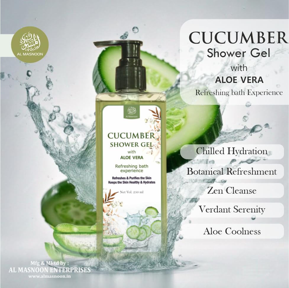Revitalize your daily routine with Al Masnoon Cucumber Shower Gel with Aloe Vera. This refreshing 250ml shower gel combines the hydrating properties of aloe vera with the cooling essence of cucumber providing a delightful cleanse that leaves your skin feeling rejuvenated and refreshed. The natural ingredients work harmoniously to gently cleanse away impurities while maintaining your skin's moisture balance making it perfect for all skin types. The crisp cucumber fragrance invigorates your senses creating a spa-like experience in your own bathroom. Free from harsh chemicals this shower gel is suitable for daily use ensuring your skin feels soft smooth and nourished after every wash. Pack of 1 an essential addition to your personal care collection for a truly refreshing bath experience.
