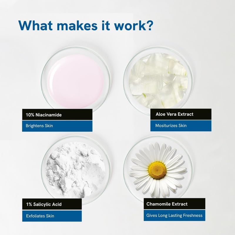 I used the salicylic acid body wash for a week instead of clearing the pimples acne it creates it worst and got many new pimples all over body so stop using it and niacinamide body lotion is quite good