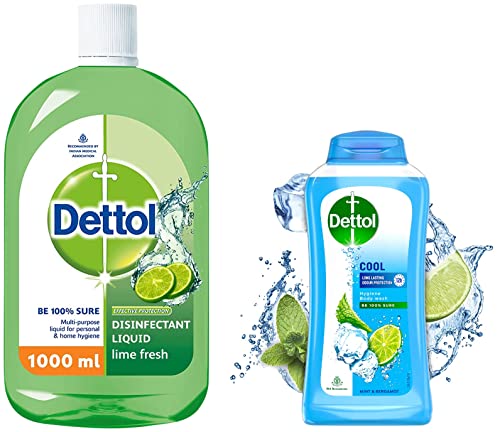 Dettol Liquid Disinfectant for Floor Cleaner Surface Disinfection Personal Hygiene (Lime Fresh 1L)Dettol Disinfectant Multipurpose Liquid cleaner provides protection to you and your family against illness causing germs. This disinfectant liquid sanitizes your home and also helps maintain your personal hygiene. It can be used in bath laundry floor and surface cleaning leaving everything clean and fresh. This multipurpose disinfenctant cleaner for home is recommended by Indian Medical Association. USAGE: Recommended dilutions to protect your family from germs: Bathing - 1 capful to a bucket of water (10 litres); Kitchen Slab - 1 capful to a litre of water; Shaving - 1 capful to a litre of water; Floor Cleaning - 1 capful to a litre of water; Laundry - 1 capful to a litre of water in the last rinse; Refrigerator - 1 capful to a litre of water. If swallowed seek immediate medical advise.Dettol Body Wash and Shower Gel for Women and Men Cool - 250ml | Soap-Free Bodywash | 12h Odour ProtectionDettol Hygiene Body wash Cool combines Dettolâs trusted germ protection with crispy menthol and leaves your skin feeling fresh.