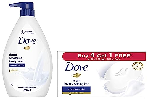 Dove Cream Beauty Bathing Bar 125 g (4+1 Free Combo) With Moisturising Cream for Softer Glowing Skin & Body - Nourishes Dry Skin more than Bar SoapDove Cream Bathing Beauty Bar combines a gentle cleansing formula with Doveâs signature ¼ moisturizing cream to give you softer smoother and more glowing skin with every shower.What makes Dove different? Doveâs beauty bars gently cleanse your skin and help retain its natural moisture rather than stripping it away. While ordinary soaps may leave your skin feeling dry and tight Dove cream Beauty Bar helps your skin maintain its natural moisture barrier and keep skin hydrated. Its moisturising and nourishing formula leaves skin soft smooth and glowing.Dove is the No.1 Soap Brand recommended by dermatologists. It is pH balanced and mild on skin making it suitable for all skin types. It has gentle cleansers which are suitable for dry and sensitive skin also. It cares for your skin and washes away germs. Regular soap may dry out your skin but the classic moisturizing formula of Dove bars will leave skin softer smoother and more glowing.For best results lather up your Dove Cream Beauty bathing bar and massage the smooth creamy lather over your face and body before rinsing thoroughly. Dove cares for skin and washes away germs.Try Dove And feel the Dove difference. Get soft smooth and glowing skin.Dove Deeply Nourishing Body Wash With Moisturisers For Softer Smoother Skin For All Skin Type 800 mlWho doesnât like having smooth skin? We all want to keep our skin looking healthy nourished and well cared for and itâs much easier to make that a regular part of your routine if youâve found a moisturising body wash.This moisturising body wash combines Nutrium Moisture⢠with mild cleansers to help your skin retain its natural moisture leaving you with softer smoother skin.There are 631 million beautiful women in India. Women of all ages shapes sizes and skin tones. Yet as a society weâre often led to believe in a very limited idea of beauty. And while youthful looks fair skin long black flowing hair and a trim figure are some ways to express beauty â they are not the only ways. With your help we can represent the true diversity of beauty in India and empower every woman to realise her personal beauty potential. Together we can break the rules and change the face of beauty.We donât believe that the 631 million women living in India can possibly be represented by just one beauty ideal. Ours is a country rich in diversity and thatâs something we can all be proud of especially when it comes to beauty. We received an incredible response when we asked you to help us showcase #Real Beauty. We think that speaks volumes about how much we all want to see a more diverse range of beauty represented in India.