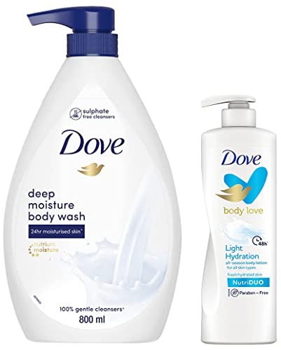 Dove Deep Moisturizing Body Wash 800 ml Mild Body Cleanser for Soft & Smooth Skin - Paraben Free Liquid Body Wash 24hrs MoisturizationWho doesnât like having smooth skin? We all want to keep our skin looking healthy nourished and well cared for and itâs much easier to make that a regular part of your routine if youâve found a moisturising body wash. This moisturising body wash combines Nutrium Moisture⢠with mild cleansers to help your skin retain its natural moisture leaving you with softer smoother skin. There are 631 million beautiful women in India. Women of all ages shapes sizes and skin tones. Yet as a society weâre often led to believe in a very limited idea of beauty. And while youthful looks fair skin long black flowing hair and a trim figure are some ways to express beauty â they are not the only ways. With your help we can represent the true diversity of beauty in India and empower every woman to realise her personal beauty potential. Together we can break the rules and change the face of beauty. We donât believe that the 631 million women living in India can possibly be represented by just one beauty ideal. Ours is a country rich in diversity and thatâs something we can all be proud of especially when it comes to beauty. We received an incredible response when we asked you to help us showcase #Real Beauty. We think that speaks volumes about how much we all want to see a more diverse range of beauty represented in India. Try this : For even softer skin pair your Dove body wash with a puff. It will help to exfoliate away dead skin leaving it feeling fresh and beautiful. Simply apply the body wash to the puff instead of your hand and then gently buff over your body in a circular motion.Dove Body Love Light Hydration Body Lotion For All Skin Types Paraben Free 48hrs Moisturisation with Plant Based moisturiser Fresh Hydrated Skin 400mlDove Loves Your Body Unconditionally. Dove knows that managing body skin can be tricky and itâs not always easy to keep your skin feeling and looking its best. But thereâs no need to give up. Presenting Dove Body love Light Hydration Body Lotion. Its unique Nutri duo Paraben Free Formula goes beyond the surface 10 layers** deep to nourish your skin from Within. Result? Fresh Hydrated Soft Skin in all seasons and for All Skin Types And thatâs not all. This Body care is with plant based moisturiser & is dermatologically tested suitable for every day and perfect for everyone. Its Unique Formulation Gives 48hrs Long Lasting Moisturisation. For an indulgent treat youâll be dreaming of for days simply massage this body lotion on your skin on lower legs arms elbows and knees Smooth it on in wide circles gradually getting wider until absorbed. The Lotion absorbs quickly in the skin and making you Experience the Goodness of Dove that lasts. Try applying your lotion before bed or stepping out everyday and let your body experience the body love it deserves. Dove does not test on animals anywhere in the world and is PETA certified Cruelty-Free. ** Within Stratum Corneum