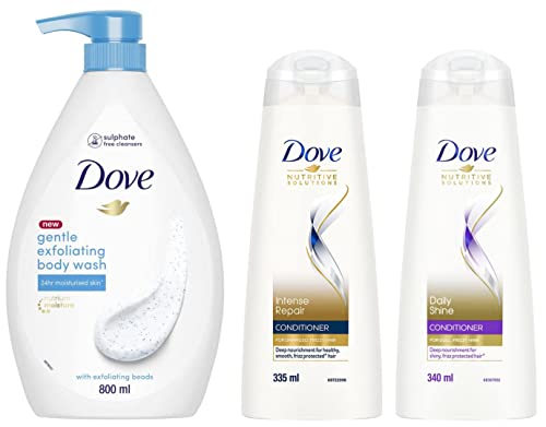 Dove Gentle Exfoliating Nourishing Body Wash Mild Cleanser Moisturizes Skin Balances Ph For All Skin Type 800 mlLooking for a body wash that cleans like a soap and moisturises like cream? Dove Nourishing Freshness with Exfoliating Beads does both. It's enriched with a gentle exfoliating formula and Doveâs signature ¼ moisturizing cream to give you softer smoother skin after every shower. Its NutriumMoisture technology and mild cleansers penetrates upto 3 layers deep to help your skin retain its natural moisture leaving you with nourished healthier looking skin. It's mild pH-balanced formula makes it a great body wash for dry skin unlike typical bathing soap or shower gel. Dove Body Wash nourishes deep into the surface layers of the skin and helps strengthen your skinâs moisture barrier. For best results squeeze the moisturizing body wash into your hand or onto a loofah and work it into a rich creamy lather. Massage it over your skin concentrating on areas that feel a little drier than usual. Rinse off revealing soft smooth nourished skin. There are 631 million beautiful women of all ages shapes sizes and skin tones in India. Yet we often see things one dimensionally. Together we can break the rules and represent the true diversity of beauty in India and empower each and every woman in India.Dove Intense Repair Hair Conditioner With Keratin Actives to Smoothen Dry and Frizzy Hair - Deep Conditioner for Damaged Hair for Men & Women 335MLDoes your hair get frizzy and unmanageable? Are you left wishing for a remedy to fix your frizzy tassels? Do you want to know the secret to fixing frizzy hair? Try New Dove Intense Repair Conditioner. Control frizz with a nourishing conditioner thatâs formulated to nourish and help with frizz prevention. Formulated with Keratin Actives Dove Intense Repair Conditioner helps to nourish dry and frizzy hair with two-way care. It controls external signs of dryness in the form of frizz while nourishing strands to help them look their best. This conditioner for frizzy damaged hair leaves hair visibly smooth and more manageable â giving you smoother hair* that you will be proud of. Use it after your shampoo on damp hair for best results. This nourishing conditioner works immediately to smoothen the hair surface deeply nourishing to moisturize hair strands for healthier looking and smoother*hair use Dove repair conditioner. With every use youâll be left with shiny and beautiful hair. Buy New Dove Intense Repair conditioner and treat your hair to a look that will be the cause of envy among all your friends. Dove Conditioners for 100% care. *Based on lab test with Dove Intense Repair system vs non-conditioning shampooDove Daily Shine Conditioner 335/340 ml (volume may vary)DETANGLES HAIR GIVING IT AN UNBELIEVABLE SHINE Tangles and frizz not only make hair look dull but can also lead to increased hair breakage while combing. That's why shampoo alone is not enough. Use Dove Daily Shine Conditioner everytime after shampoo for detangled smooth hair with an unbelievable shine. Infused with Nutritive serum it detangles hair along the lengths adding shine taming frizz and making hair so smooth that your comb will slide through. For best results follow the below 3 steps: 1. SQUEEZE half to one spoon of Dove conditioner for shoulder length hair 2. SLIDE it from ears to tips where hair tangles and breaks more easily. 3. WAIT for a minute and WASH with water only thoroughly. Try Dove Daily Shine Conditioner for softer shinier easily manageable hair from the very first wash.