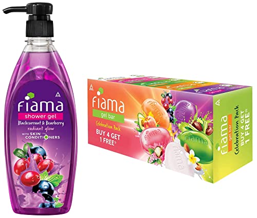 Fiama Gel Bar Celebration Pack with 5 unique Gel Bars with skin conditioners for moisturized skin 125g soap (Buy 4 get 1 Free)Fiama Gel Bar 125g (Pack of 4) with 1 Multi-VariantFiama Shower Gel Bearberry and Blackcurrant 500 mlWash away the troubles of your day with the foamy fresh and fun Fiama Body Wash. And while you enjoy your Fiama bath let its skin-conditioners work their magic to give your skin a radiant glow.This Blackcurrant and Bearberry shower gel has an indulgent fragrance that transforms a normal shower into a spa-like experience. It is filled with goodness of natural ingredients which helps your skin glow. So get ready to make every bath a highlight of your day.