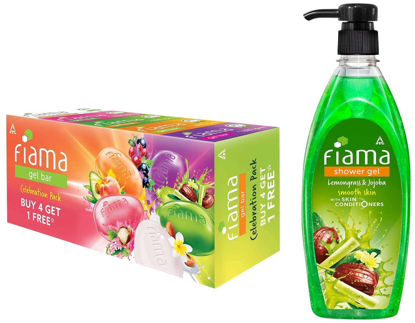 Fiama Shower Gel Lemongrass & Jojoba Body Wash With Skin Conditioners For Smooth Skin 500ml PumpWash away the troubles of your day with the foamy fresh and fun Fiama Body Wash. And while you enjoy your Fiama bath let its skin-conditioners work their magic to make your skin soft and smooth. This Lemongrass and Jojoba shower gel wakes you up and pulls you out of a dull day with its zingy citrus fragrance. It is filled with natural goodness which gently exfoliates your skin and makes it smooth. So get ready for a smooth start to your day with Fiama.Fiama Gel Bar Celebration Pack With 5 unique Gel Bars & Skin Conditioners For Moisturized Skin 125g Soap (Buy 4 Get 1 Free)Wash away the troubles of your day with the foamy fresh and fun Fiama Gel Bars. And while you enjoy your Fiama bath let its skin-conditioners work their magic to give you soft moisturised and glowing skin. Try the Fiama Celebration pack with 5 different gel bars each with unique ingredients and natural goodness that will refresh your mind and body. So uplift your mood and get ready to make every bath a highlight of your day.