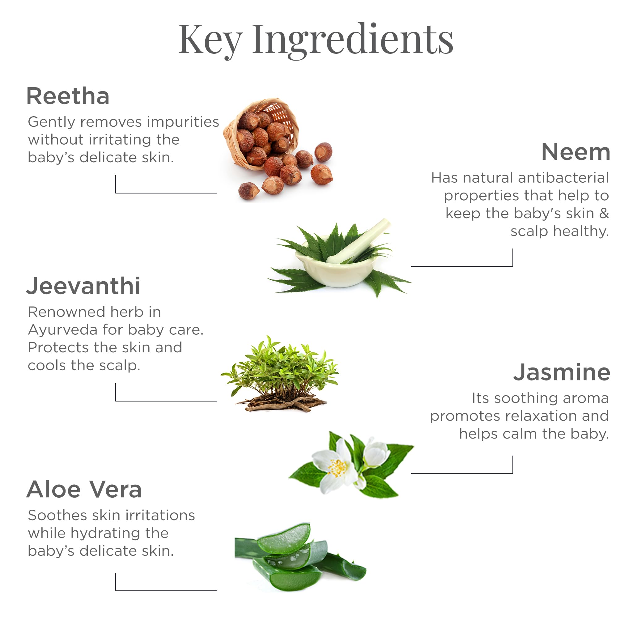 Blended with mild natural cleanser reetha to care for the delicate skin of your baby