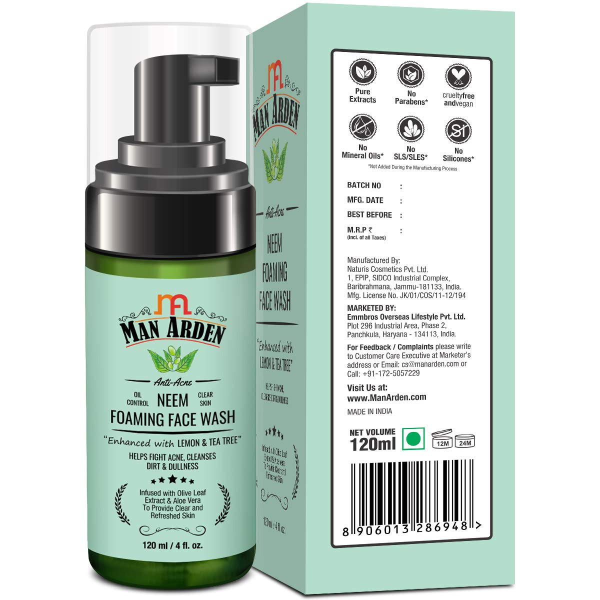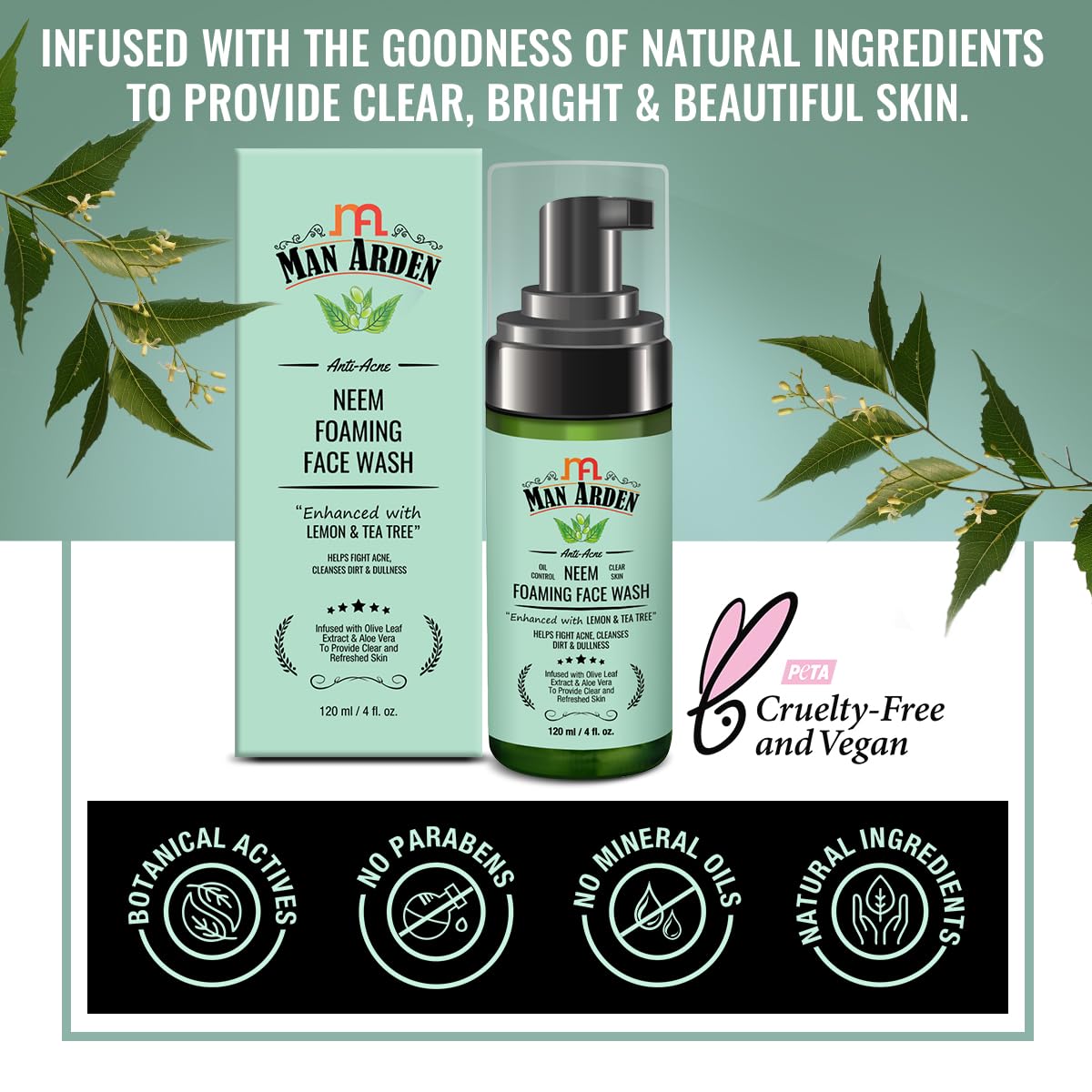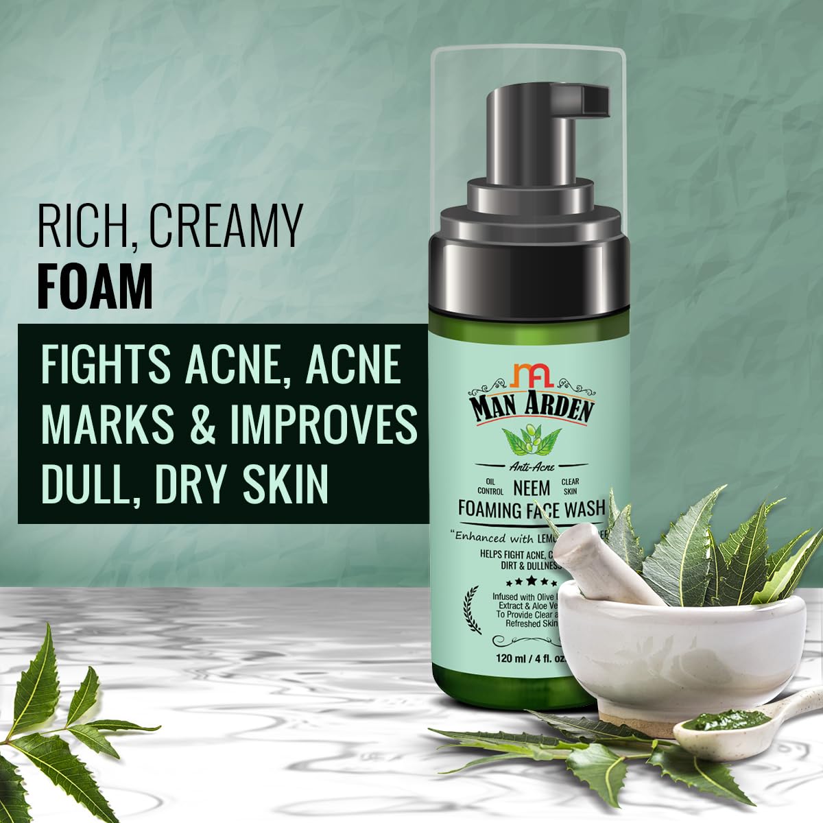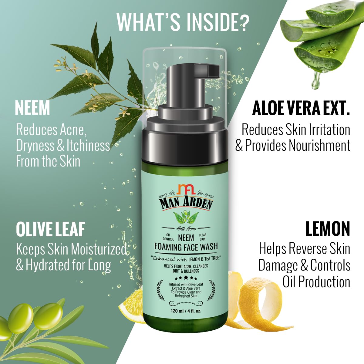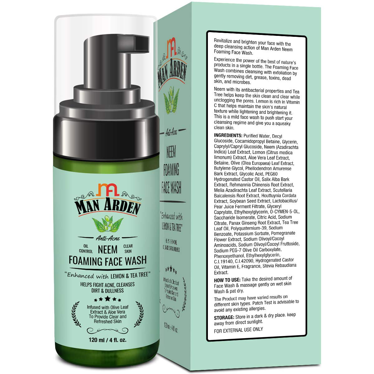 Man Arden Anti-Acne Neem Foaming Face Wash - Helps Fight Acne Cleanses Dirt And Dullness - Infused With Olive Leaf Extract And Aloe Vera 120ml