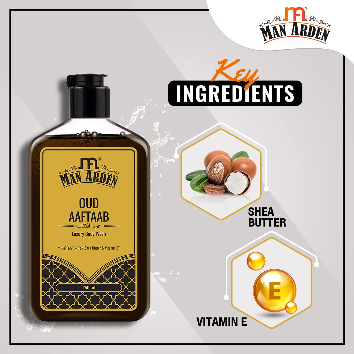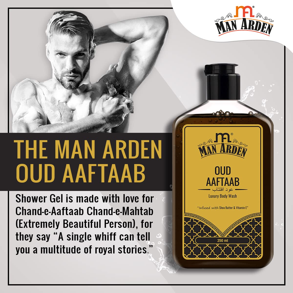 Mesmerising & Luxurious Bathing Experience: Man Arden Oud Aaftaab Luxury Body Wash offers you a mesmerising royal aroma after every bath. It is crafted using a rich blend of moisturizing ingredients that leave your skin feeling smooth and beautifully frag