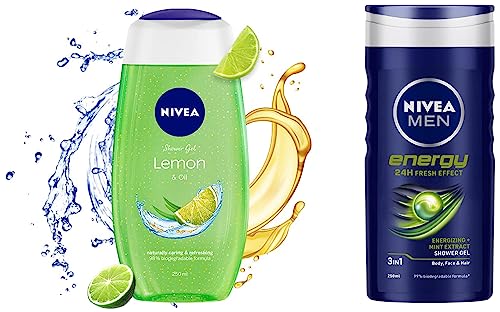 NIVEA Shower Gel Lemon & Oil 250mlLet this fresh shower gel with care oil pearls envelop your skin with a silky soft foam while its revitalizing scent of lemon stimulates your senses. The caring formula pampers your skin leaving it feeling moisturized. Turn an everyday shower into a moment full of freshness & care.NIVEA MEN Hair Face & Body Wash Energy Shower Gel 250mlLet the fresh scent invigorate your senses while the hydrating 3-in-1 shower gel for Body Face and Hair with mint extract deeply cleanses to leave you feeling refreshed and energised Recharge your batteries with every shower! Result : Leaves your skin and hair feeling refreshed revitalized and deeply cleansed