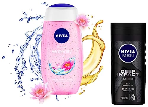 NIVEA Shower Gel, Water Lily & Oil Body Wash, Women, 250ml And NIVEA Men Shower Gel, Deep Impact Cleansing Body Wash, Men, 250ml