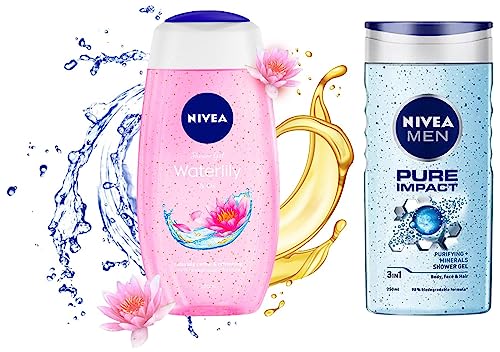 NIVEA Shower Gel, Water Lily & Oil Body Wash, Women, 250ml And NIVEA Men Shower Gel, Pure Impact Body Wash, 250ml