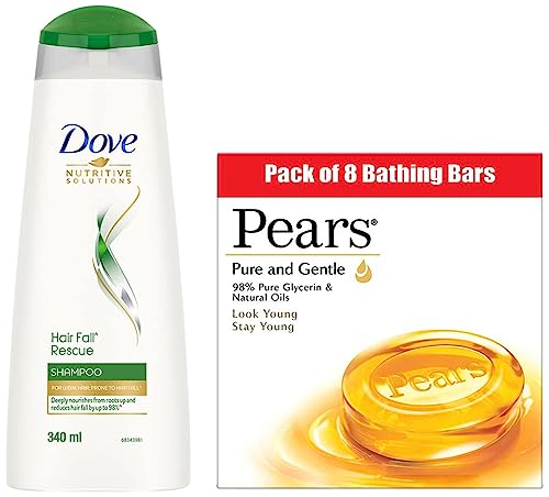 Pears Pure And Gentle Bathing Bar 125g (Pack Of 8)Pears Pure and gentle is the original 225 years old glycerin bar that gives the gentle care of natural oils and 98% pure glycerin to your skin. It is the worldâs first transparent soap and advertised brand. Its undisputed credentials on mildness and purity driven by its unique shape and transparency lend the brand an equity that lasts till this date. Pears is amongst the iconic brands in India. The Pears bar with its 98% pure glycerin preserves the beauty of your skin keeping it young. Pears treats your skin gently causing lesser damage than even baby soaps. Pears which has 30 times more moisturisers than regular beauty soaps and is proven to deposit glycerin in 10 layers of skin. It increases hydration of your skin after a single wash. Pears also offers a 100% soap free Pure and Gentle hand wash which is specially made to take care of your skin cleansing thoroughly yet softly. It is a gentle way for you to attain clean healthy looking skin. It is skin pH balanced and contains skin conditioning agents and mild cleansers. It is hypoallergenic and non-comodogenic. The Pure and Gentle Bar from Pears is available right here - Buy it Now!Dove Hair Fall Rescue Shampoo 340mlWe love the feeling of beautiful hair â but daily damage can leave your hair prone to breakage. Let hair fall be an issue of the past. Use the hair fall rescue shampoo from Dove regularly to get thick and luscious hair as the shampoo works to reduce hair fall by up to 98 percent . Specially formulated for better hair fall control Dove nutritive solutions hair fall rescue shampoo strengthens and nourishes fragile hair from roots up. Perfect as a daily hair fall treatment the gentle formula fortifies strands to reduce hair fall . Enriched with nutrilock actives our best shampoo for hair fall immediately seals cuticles and strengthens strands to help minimize hair fall due to breakages leaving them looking fuller. Healthier hair means lesser breakage and reduced hair fall . Buy Dove hair fall rescue shampoo and forget your hair fall troubles. Leaving your hair feeling strong and beautiful day after day. Say no to hair fall worries and do more in life. Dove hair fall rescue lets you be stronger bolder and closer every day. Hair fall refers to hair breakage based on a lab test with Dove hair fall rescue system vs non-conditioning shampoo.