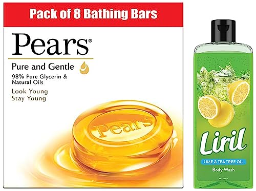 Pears Pure And Gentle Bathing Bar 125g (Pack Of 8)Pears Pure and gentle is the original 225 years old glycerin bar that gives the gentle care of natural oils and 98% pure glycerin to your skin. It is the worldâs first transparent soap and advertised brand. Its undisputed credentials on mildness and purity driven by its unique shape and transparency lend the brand an equity that lasts till this date. Pears is amongst the iconic brands in India. The Pears bar with its 98% pure glycerin preserves the beauty of your skin keeping it young. Pears treats your skin gently causing lesser damage than even baby soaps. Pears which has 30 times more moisturisers than regular beauty soaps and is proven to deposit glycerin in 10 layers of skin. It increases hydration of your skin after a single wash. Pears also offers a 100% soap free Pure and Gentle hand wash which is specially made to take care of your skin cleansing thoroughly yet softly. It is a gentle way for you to attain clean healthy looking skin. It is skin pH balanced and contains skin conditioning agents and mild cleansers. It is hypoallergenic and non-comodogenic. The Pure and Gentle Bar from Pears is available right here - Buy it Now!Liril Lemon and Tea Tree Oil Body Wash 250 mlWake up fresh. Presenting new Liril lemon and tea tree body wash by unleashing the foam with our new range of body washes wake up fresh. Get ready for the most intense shower wrapped with the fresh fragrances. Watch the unique gel transform your shower experience leaving you fresh every day. Pour a drop of the freshness body wash and gently lather with a pouf. Massage all over your body to let your lather revive your senses every day. The ingredients in Liril body wash gives you a thick lather which lends a sense of freshness after every shower and makes bathing an enjoyable experience. Liril body wash gives you a fragrance which not only lasts whole day long but also keeps your skin healthy it ensures that your skin gets the best care and stays fresh after every wash. Liril body wash range has: Liril lemon and tea tree body wash Liril cooling mint body wash Liril berry blast body wash variants to choose from. How to use Liril body wash: Squeeze small amount of Liril body wash on wet hands. Work into a rich creamy lather. Apply gently over wet skin and then rinse off. Liril body wash is available right here - buy it now.