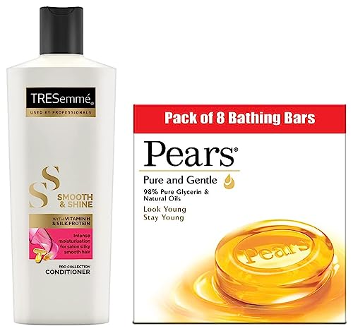 Pears Pure And Gentle Bathing Bar 125g (Pack Of 8)Pears Pure and gentle is the original 225 years old glycerin bar that gives the gentle care of natural oils and 98% pure glycerin to your skin. It is the worldâs first transparent soap and advertised brand. Its undisputed credentials on mildness and purity driven by its unique shape and transparency lend the brand an equity that lasts till this date. Pears is amongst the iconic brands in India. The Pears bar with its 98% pure glycerin preserves the beauty of your skin keeping it young. Pears treats your skin gently causing lesser damage than even baby soaps. Pears which has 30 times more moisturisers than regular beauty soaps and is proven to deposit glycerin in 10 layers of skin. It increases hydration of your skin after a single wash. Pears also offers a 100% soap free Pure and Gentle hand wash which is specially made to take care of your skin cleansing thoroughly yet softly. It is a gentle way for you to attain clean healthy looking skin. It is skin pH balanced and contains skin conditioning agents and mild cleansers. It is hypoallergenic and non-comodogenic. The Pure and Gentle Bar from Pears is available right here - Buy it Now!TRESemme Smooth and Shine Conditioner 190mlLaunched in 1948 TRESemmé was named after renowned hair care expert Edna Emmé. Up until the 1950's TRESemmé was sold only in salons. Today it is available at a shop near you so that you can have salon style hair at home. For over 60 years TRESemmé has built a history of success in 13 countries around the world. From its origins in 1947 and salon expertise TRESemme has been driven by a simple truth: every woman deserves to look & feel fabulous like she has just stepped out of the salon everyday. This range has been carefully selected for its advanced formula. Driven by our salon heritage we work with our stylists to deliver expert solutions from salon quality products without the salon price tag. Our salon inspired products enriched with high quality ingredients help you experience that salon feeling everyday. With Vitamin H and silk protein TRESemme Smooth & Shine conditioner provides intense moisturisation for salon smooth silky hair. It has an advanced smoothing system that is enriched with Moroccan Argan oil. It controls frizz and fly aways without weighing your hair down. For hair that feels detangled more manageable soft and smooth. For best results use after the TRESemme Smooth & Shine Shampoo.