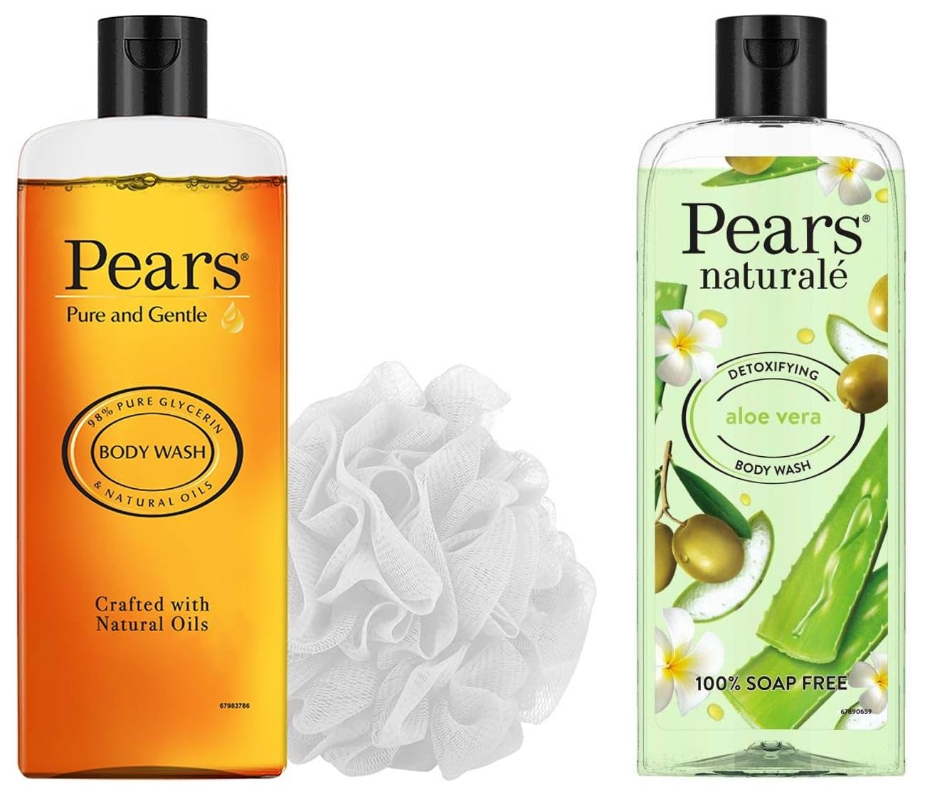 Pears Pure & Gentle Shower Gel 250 ml with (Free Loofah)Did you know that glycerine is one of the well-known ingredients that helps preserve the natural moisture of your skin? Pears Pure & Gentle Body Wash with 98% pure glycerine is known to hydrate and moisturise for a glowing skin. Pears Pure & Gentle Body Wash also has natural oils and gentle cleansers that leaves your skin feeling soft smooth and moisturised. Itâs formula is 100% soap free yet it cleanses your skin thoroughly leaving it feeling refreshed. It has a pleasant soothing and refreshing fragrance too. Pears Body Wash can also be used as a handwash it removes 99.9% germs (as per lab test done in 2020 on select germs) Try Pears Pure & Gentle Body Wash 1) With 98% pure glycerine 2) 100% Soap Free 3) Gentle enough for daily use even on delicate skin 4) Dermatologically Tested Pears Pure & Gentle Body Wash is easy to use: 1) Squeeze a small amount of Pears Body Wash on a wet loofah. 2) Work into rich bubbly lather. 3) Apply thoroughly and gently over wet skin and then rinse off and Pat dry. Experience skin that feels soft smooth and glowing.Pears Naturale Detoxifying Aloevera Bodywash 250 mlDon't you think products that have the goodness of natural ingredients in them are more suitable for you skin. Pears understands this and therefore brings to you the beautiful range of pears natural that has an exciting mix of natural ingredients. With the goodness of 100 percent natural ingredients the new pears natural range of beauty bathing bars and body washes give you naturally glowing skin. The pears natural body washes have pure glycerine leaves your skin feeling soft and smooth. Natural aloe vera detoxifying body wash has the goodness of 100 percent natural aloe vera along with olive oil. Its 100 percent soap free formula gently cleanses your skin for a visibly refreshed glowing skin every time you shower. Do you know aloe vera is known to purify and soften your skin leaving it clear and refreshed and olive oil packed with anti oxidants is known to protect skin. This gentle formula has 0 percent parabens and is mild and gentle on skin. How to use body wash. You know it. Just pour lather and rinse. Go easy on the tap. Pears natural body wash is also environmental friendly and comes in 100 percent recyclable bottles. Explore the entire pears natural range of bathing bars and body washes now available online and add them to your skin care regime.