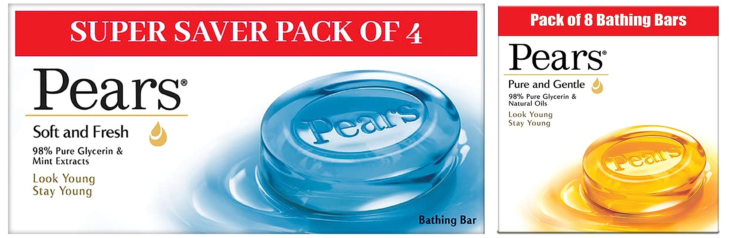 Pears Soft and Fresh Bathing Bar 125g (Buy 3 Get 1 Free)Pears Soft & Fresh Is Enriched With Mint Extracts And Pure Glycerin. Mint Extracts Keep Your Skin Looking Soft And Fresh In Summers While 98% Pure Glycerin Gently Cleanses Your Skin And Retains Its Natural Moisture Keeping It Young And Beautiful. It Does Not Contain Impurities And Preserves Your Skins Natural Beauty. About Pears: Pears Is The Original 225 Years Old Glycerin Bar That Gives The Gentle Care Of Natural Oils & 98% Pure Glycerin To Your Skin. It Is The WorldâS First Transparent Soap And Advertised Brand. Its Undisputed Credentials On Mildness & Purity Driven By Its Unique Shape And Transparency Lend The Brand An Equity That Lasts Till This Day. Pears Is Amongst The Iconic Brands In India. Pears Which Has 30 Times More Moisturisers Than Regular Beauty Soaps And Is Proven To Deposit Glycerin In 10 Layers Of Skin. It Increases Hydration Of Your Skin After A Single Wash. The Pure And Gentle Bar From Pears Is Available Right Here - Buy It Now! Also From Pears: Pears Also Offers A 100% Soap Free Pure & Gentle Hand Wash Which Is Specially Made To Take Care Of Your Skin Cleansing Thoroughly Yet Softly. It Is A Gentle Way For You To Attain Clean Healthy Looking Skin. It Is Skin Ph Balanced And Contains Skin Conditioning Agents And Mild Cleansers. It Is Hypo-Allergenic And Non-ComodogenicPears Pure And Gentle Bathing Bar 125g (Pack Of 8)Pears Pure and gentle is the original 225 years old glycerin bar that gives the gentle care of natural oils and 98% pure glycerin to your skin. It is the worldâs first transparent soap and advertised brand. Its undisputed credentials on mildness and purity driven by its unique shape and transparency lend the brand an equity that lasts till this date. Pears is amongst the iconic brands in India. The Pears bar with its 98% pure glycerin preserves the beauty of your skin keeping it young. Pears treats your skin gently causing lesser damage than even baby soaps. Pears which has 30 times more moisturisers than regular beauty soaps and is proven to deposit glycerin in 10 layers of skin. It increases hydration of your skin after a single wash. Pears also offers a 100% soap free Pure and Gentle hand wash which is specially made to take care of your skin cleansing thoroughly yet softly. It is a gentle way for you to attain clean healthy looking skin. It is skin pH balanced and contains skin conditioning agents and mild cleansers. It is hypoallergenic and non-comodogenic. The Pure and Gentle Bar from Pears is available right here - Buy it Now!