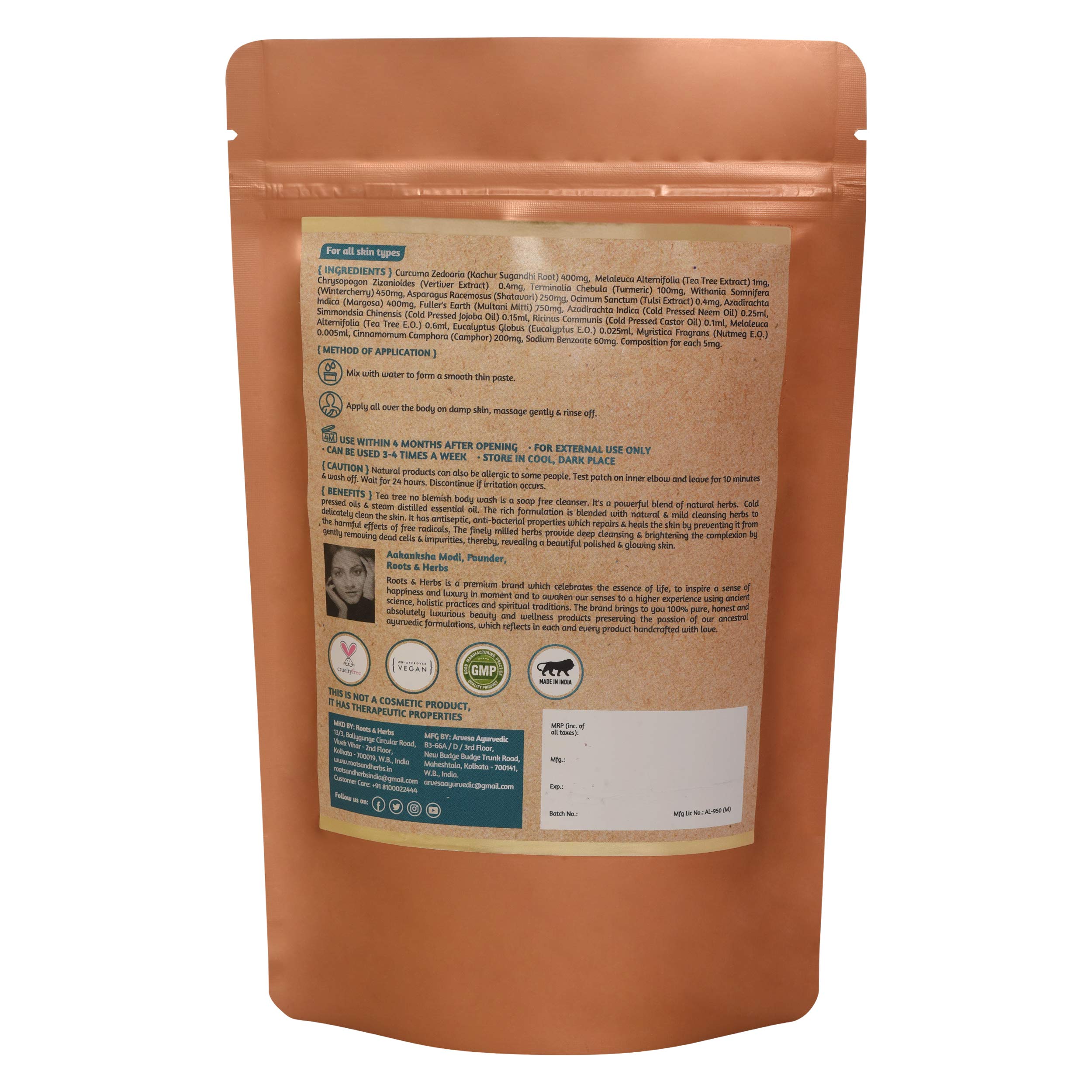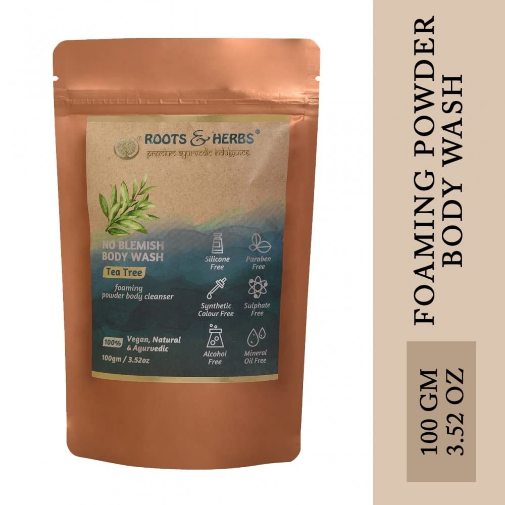 HomeBeautyBodyBath & ShowerShower Gels & Body WashROOTS AND HERBS Ayurvedic Natural Treatment 100% Vegan Paraben Free No SLS Tea Tree Body Wash Shower Powder for Women and Men for Body Odour Skin Irritations Acne (100 gms)
