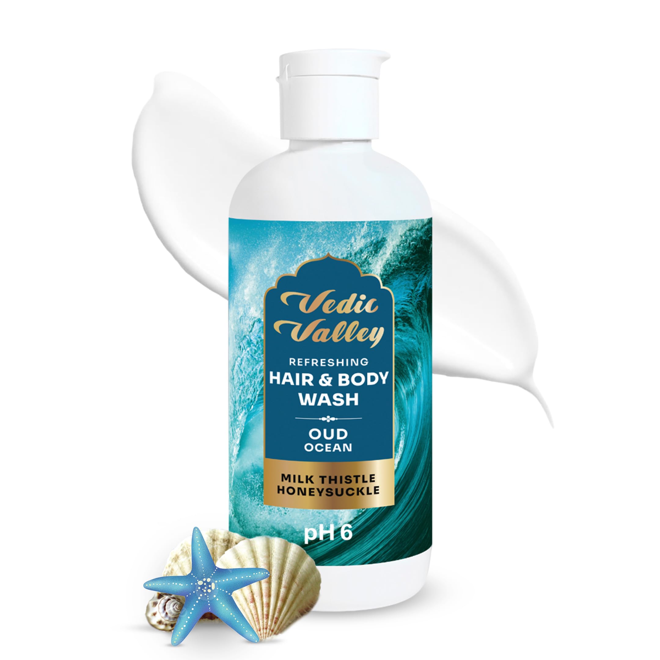 HomeBeautyBodyBath & ShowerShower Gels & Body WashVEDIC VALLEY Oud Ocean Vegan Sulphate & Paraben Free Hair & Body Wash for Men & Women - 300 ml with Organic Actives Brightens Skin Deeply Nourishes & Moisturizes Reduces Hair Fall & Loss