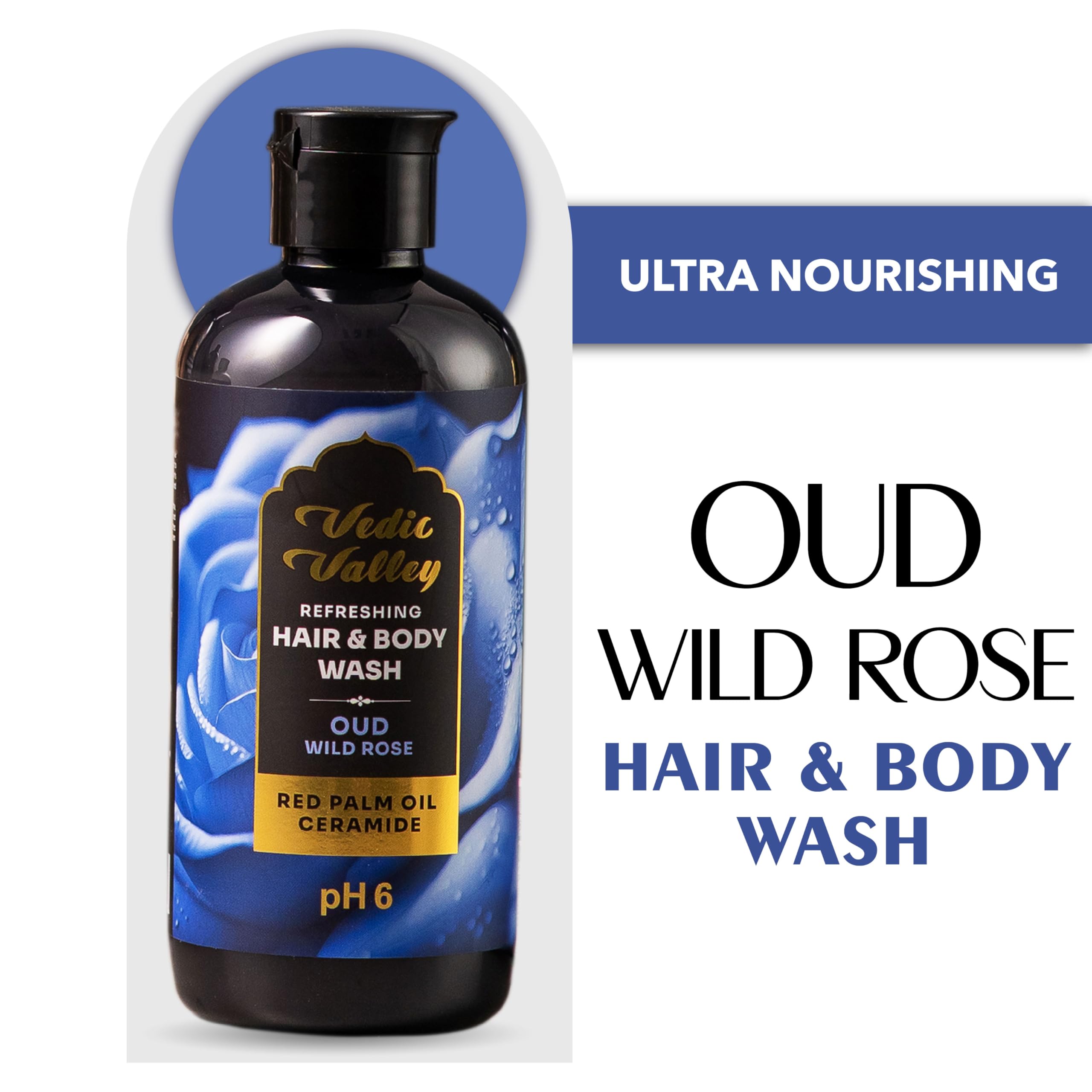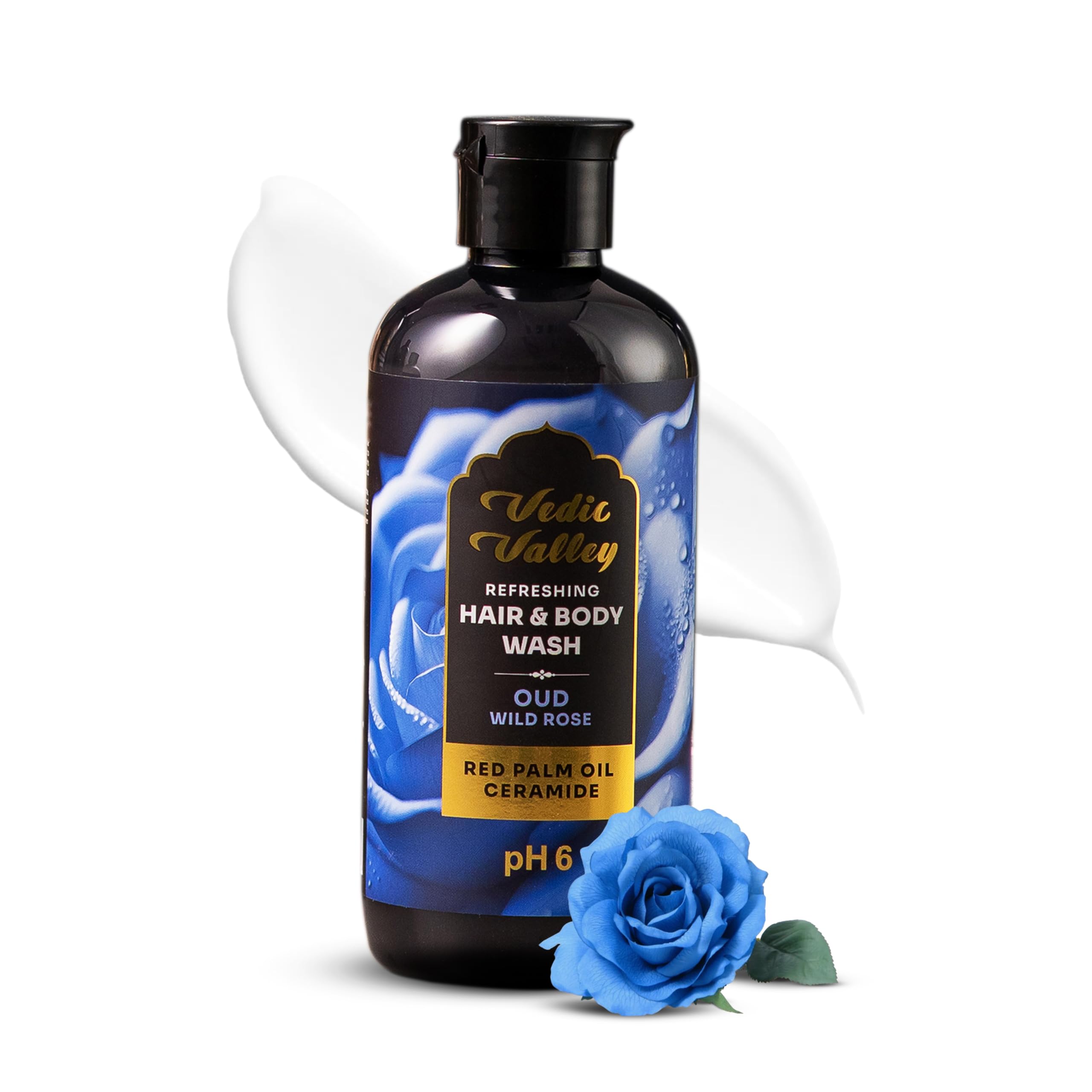 VEDIC VALLEY Oud Wild Rose Vegan Sulphate & Paraben Free Hair & Body Wash for Men & Women - 300 ml with Organic Actives Brightens Skin Deeply Nourishes & Moisturizes Reduces Hair Fall & Loss