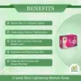 Product Features Suitable for all skin types Rejuvenates skin cells Delays the aging process Effective against pimples scars and acne AE NATURALS Crystal Q Skin Whitening Soap for Women is loaded with effective almond oil jojoba oil kojic acid and glutathione that nourish moisturize whiten and cleanse skin thoroughly. Unlike other soaps the AE Naturals whitening soap deeply nourishes the skin and brings out that natural glow. It is Paraben and SLS free. Key Ingredients Glutathione - It whitens the skin and improves skin texture and complexion. Kojic acid - Effective against hyperpigmentation. Arbutin - Extracted from the bearberry tree helps the skin to retain its natural glow and whiten dark areas. Almond oil - It helps the skin repair damaged cells Jojoba oil - Protects it from aging wrinkles and acne. Coconut oil - Moisturizes skin and keeps it elastic from a longer period of time. Benefits Suitable for all skin types Rejuvenates skin cells and delays the aging process Effective against pimples scars dark spots and acne Directions for use Wet the skin and bring the soap to lather. Let the soap sit on skin for a minute and then wash off with warm water. Use moisturizers to keep skin supple and healthy.