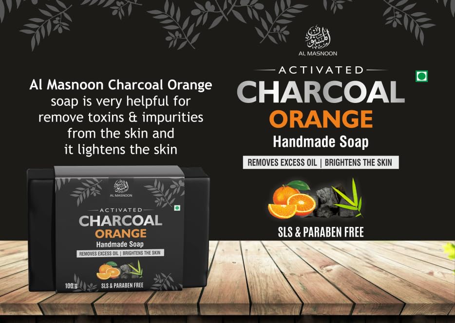 Al Masnoon Charcoal Orange Soap Made with Activated Charcoal and Orange Oil Removes Excess Oil 100g (Pack of 2) - Cleansing Soap for Oil Control and Skin Refreshment