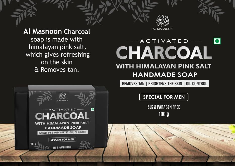 Al Masnoon Charcoal Soap is specifically formulated for men to help control oil and remove tan. Infused with charcoal and Himalayan salt this soap aims to cleanse and rejuvenate the skin offering benefits tailored for men's skincare needs.