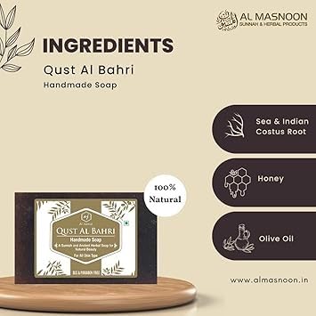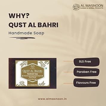 Al Masnoon Qust Al Bahri Soap is a handmade soap designed for all skin types crafted with the traditional herb known as Qust Al Bahri. This soap is formulated to provide gentle cleansing while offering potential benefits associated with this herb.
