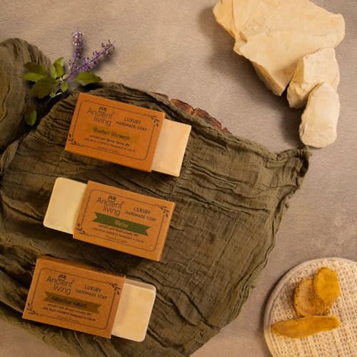 HomeBeautyBodyBath & ShowerSoapsAncient Living Organic & Natural Soaps Daily Bath Needs with Cold Pressed Oils (Handmade) - 100 gm each Kasturi Turmeric for Radiance Multani Mitti for Anti Aging Tulasi for Cleansing