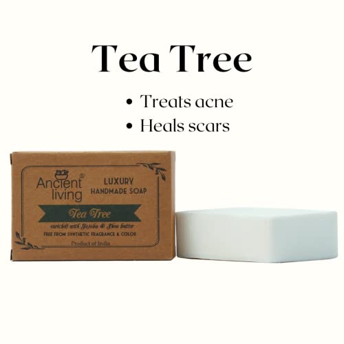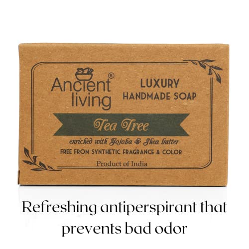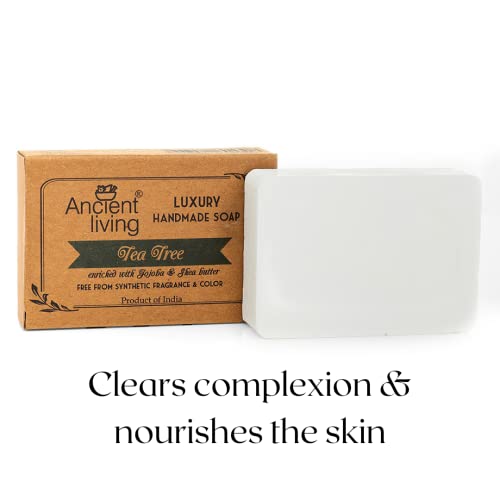 Ancient Living Tea Tree Handmade Soap is enriched with pure tea tree oil and jojoba oil along with other nutrient-rich skin nourishing oils. This tea soap works miracles by clearing your complexion. It nourishes your skin and fights potential skin diseases. This antiseptic soap eats away skin impurities and leaves you with glowing skin! Tea tree for acne is the best natural remedy. Its antiseptic and antifungal properties eliminate blemishes heal skin infections and fade scars. Its refreshing aroma acts as an antiperspirant and keeps bad odors away. jojoba oil restores your skin health. It's full of vitamin A and E which hydrate and nourish your skin. Tea tree for sensitive skin keeps it soft and gently protects it against harsh pollutants. This sudsy bar acts as a powerful cleanser and keeps your stress at bay with its refreshing aroma. It removes sun tan and brightens your complexion. It keeps bad odors away with its strong cleansing properties. Its refreshing aroma acts as a stress buster.